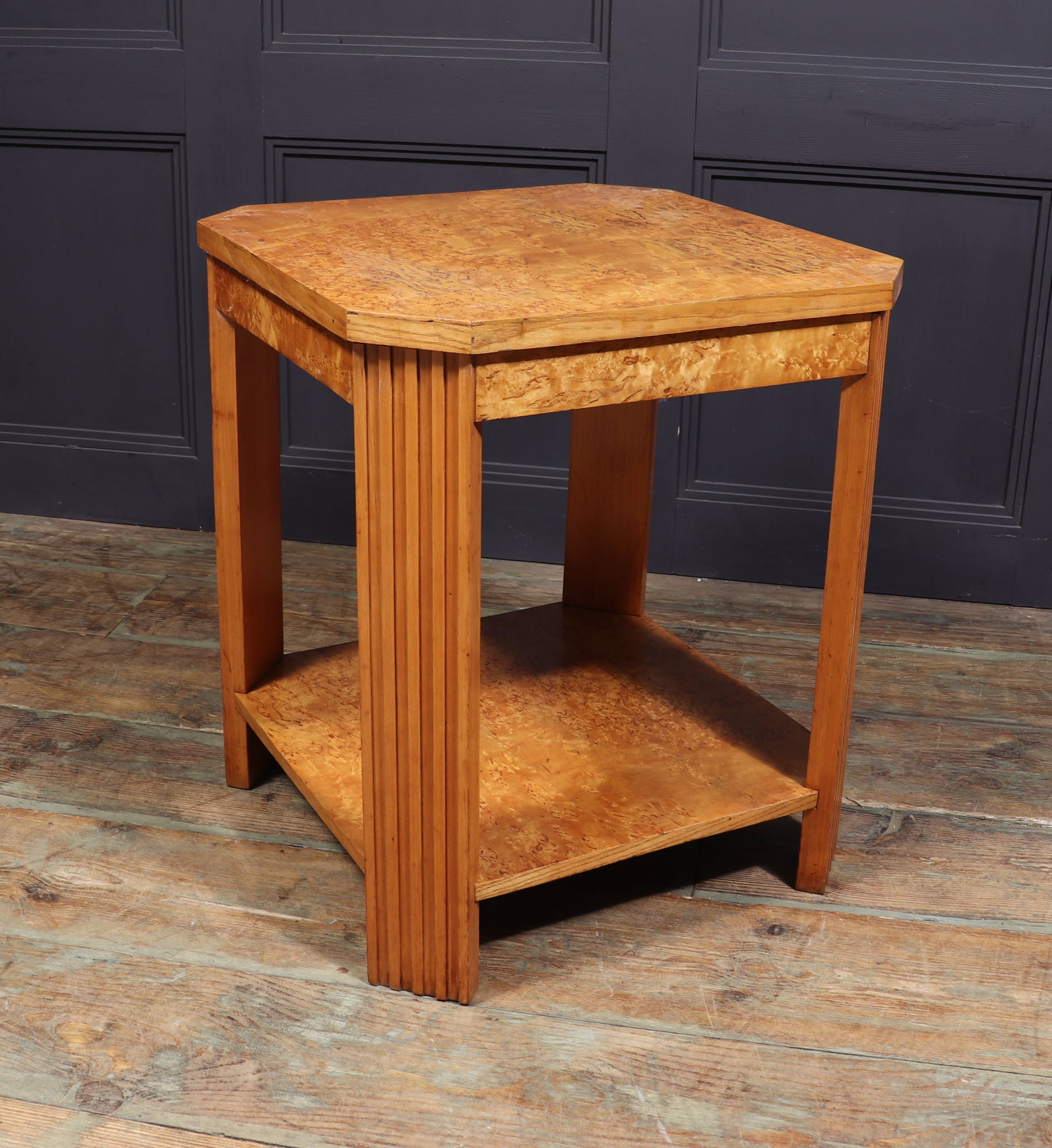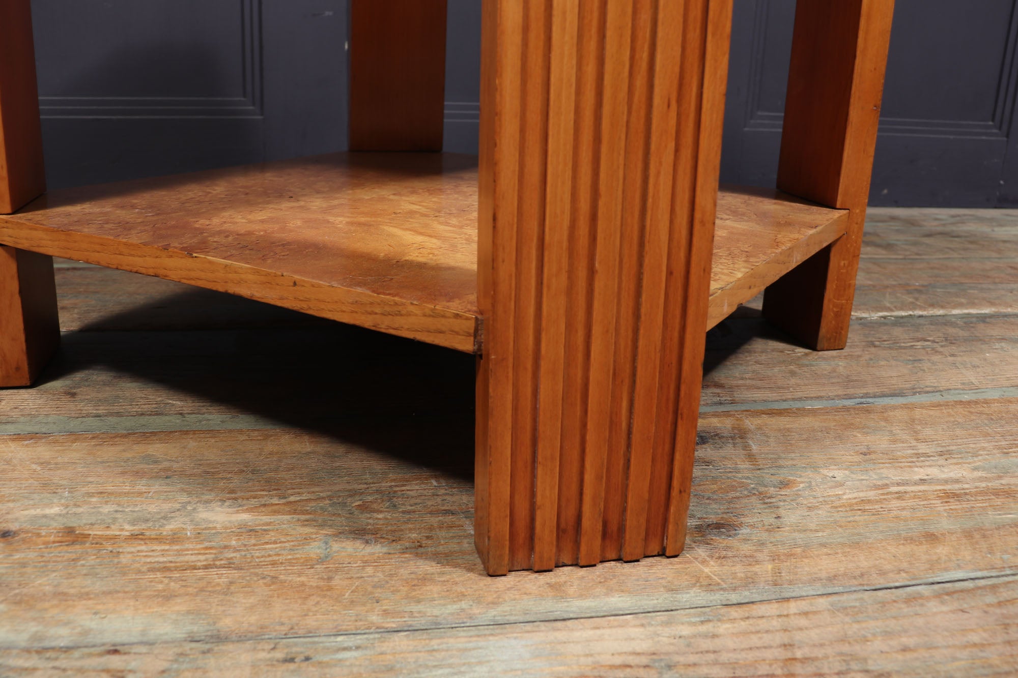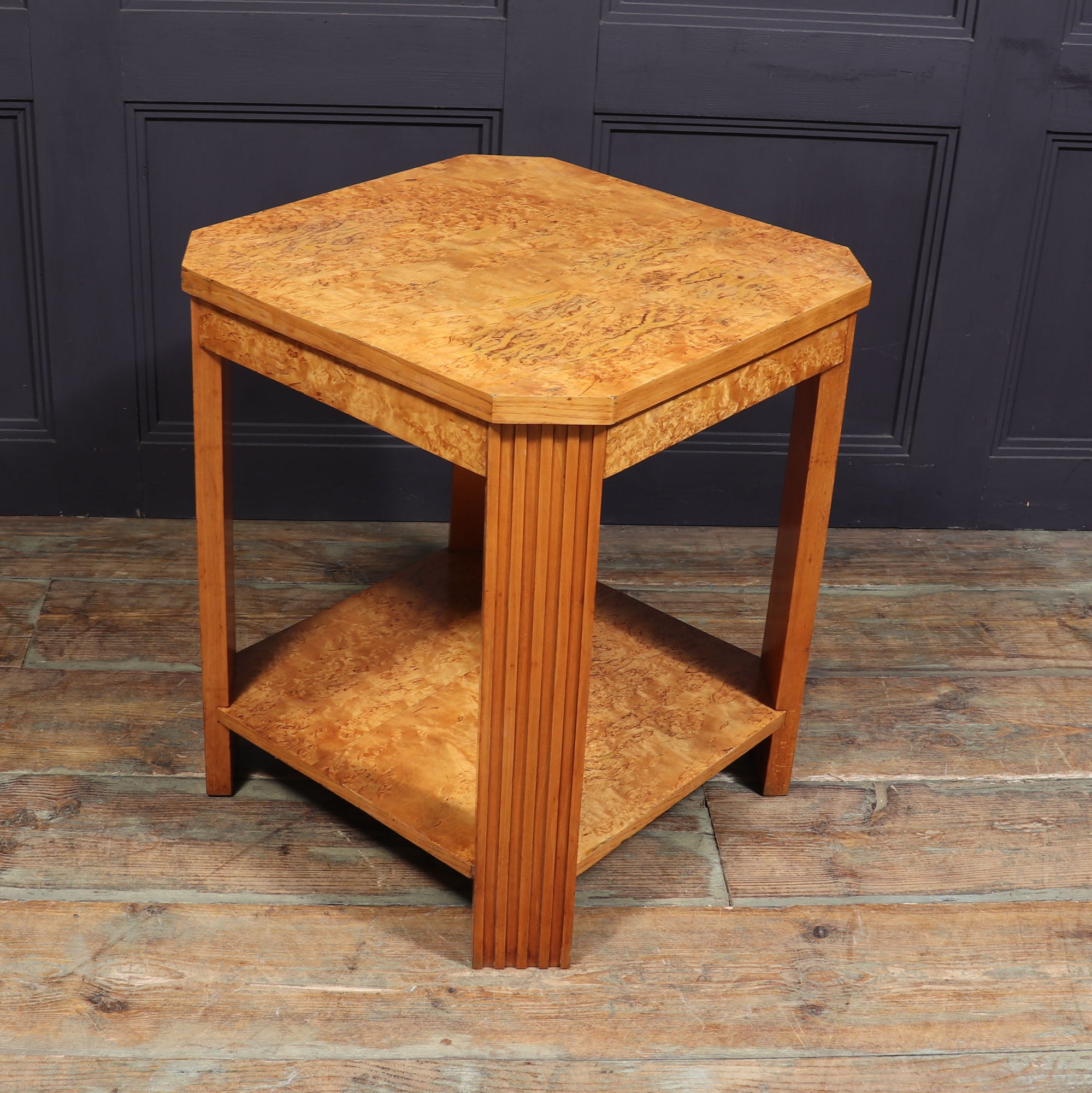 A French Art Deco table produced in the 1930’s in karelian birch with canted corners and reeded leg with a lower shelf, it has an oak lined lift up compartment with chrome fittings, the table has been polished and is very good condition