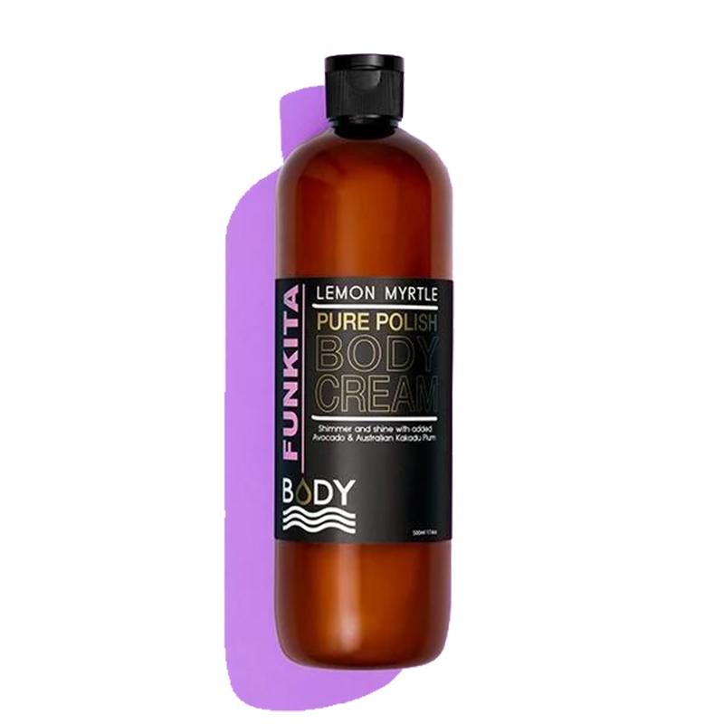 LEMON MYRTLE BODY CREAM FUNKITA BODY I’m so natural you’ll love it when I get under your skin. I’m a post-session pit stop for your body when it craves a light, nourishing pick-me-up to get you straight back on track. With cleansing lemon myrtle and the nourishment of avocado and Australian Kakadu plum I’ll get you polished up and looking like new again. INGREDIENTS: Purified Water, Certified Organic Botanical Blend of Lavender, Chamomile, Horsetail (Herb), Marigold, Rosehip, Burdock; Organic Safflower Oil, Biodynamic Avocado Oil, Biodynamic Macadamia Oil, Grapefruit Seed Extract, Australian Bush Extract of Kakadu Plum Glycerol Monostearate, Wheatgerm Oil, Jojoba Oil, Soy Lecithin, Glycerin,Citrus Seed Extract, Organic Locust Bean Gum, Vitamin E, Guar Gum, Olive Leaf Extract, Potassium Sorbate, Cetyl Stearyl Alcohol, Organic Lemon Myrtle Essential Oil, Lemongrass Essential Oil. Funkita Body is completely free of any synthetic, artificial or formaldehyde causing agents, are 100% vegan and 100% Australian made. Size: 500ml 17.6oz
