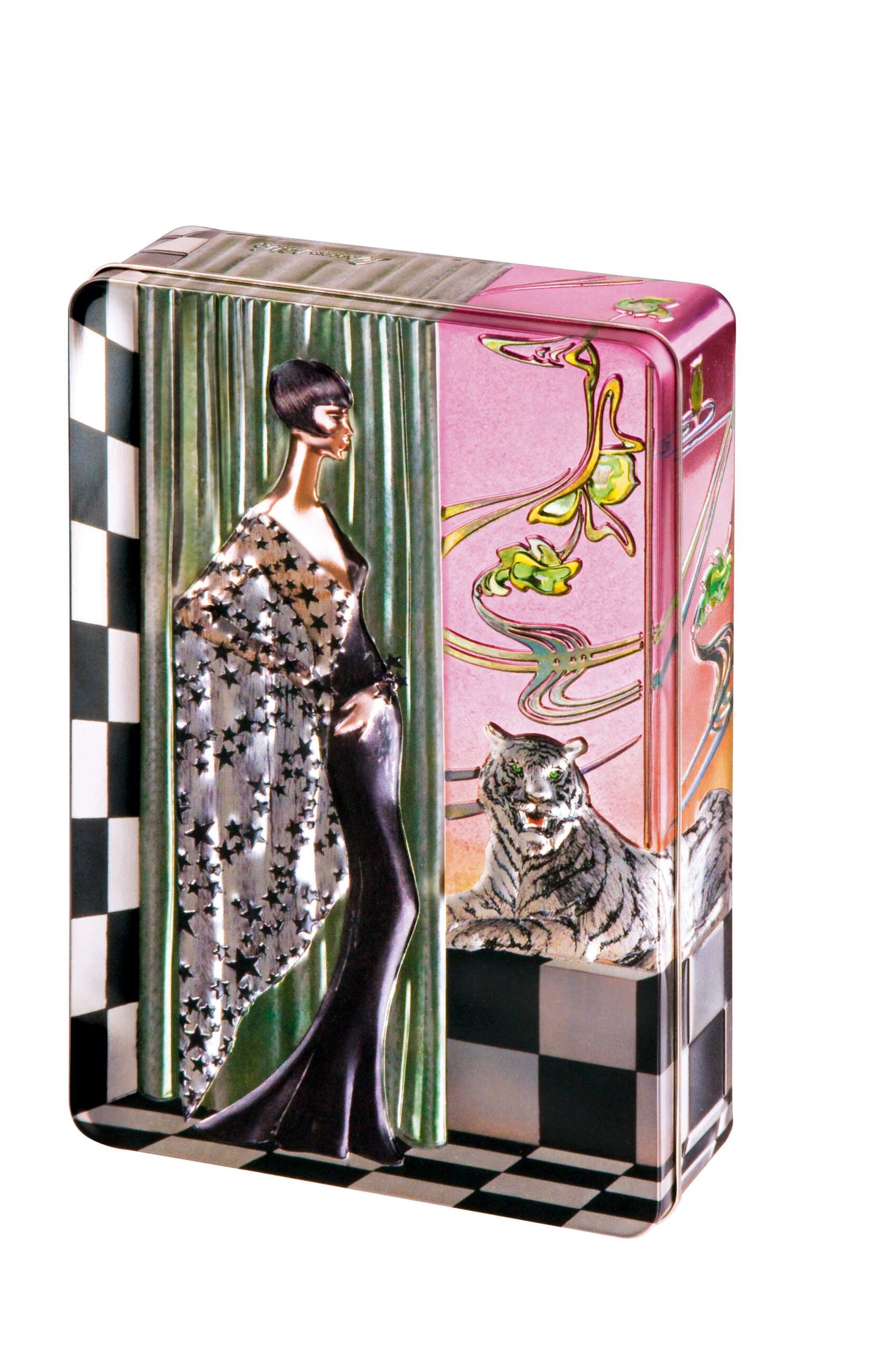 This art-deco tin is inspired by Carlos Asemundis powerful painting. Depicting a tall shapely woman dressed in a slinky black gown. Her diaphanous silver wrap studded with beautifully embossed tiny stars. Emerging from behind folds of curtaining is a recumbent tiger who looks directly at the observer. The fuchsia wall behind him patterned with a classic art nouveau design. This stunning embossed tin is a must for all lovers of the Art-nouveau/Art-Deco period. Filled with amazing Belgium Choc Chunk biscuits