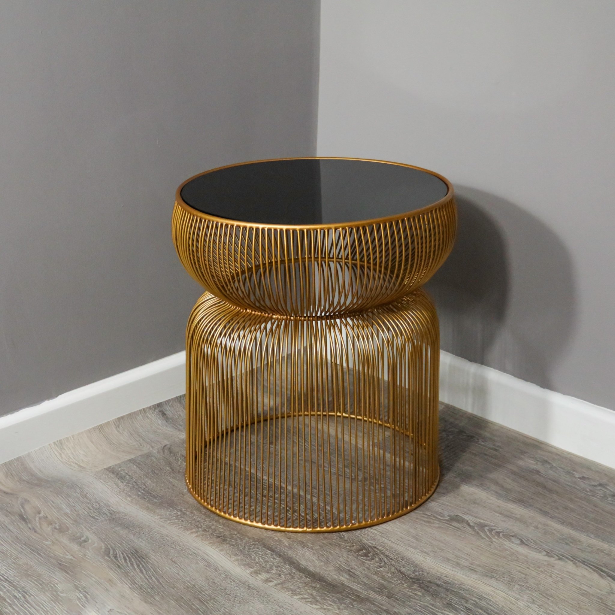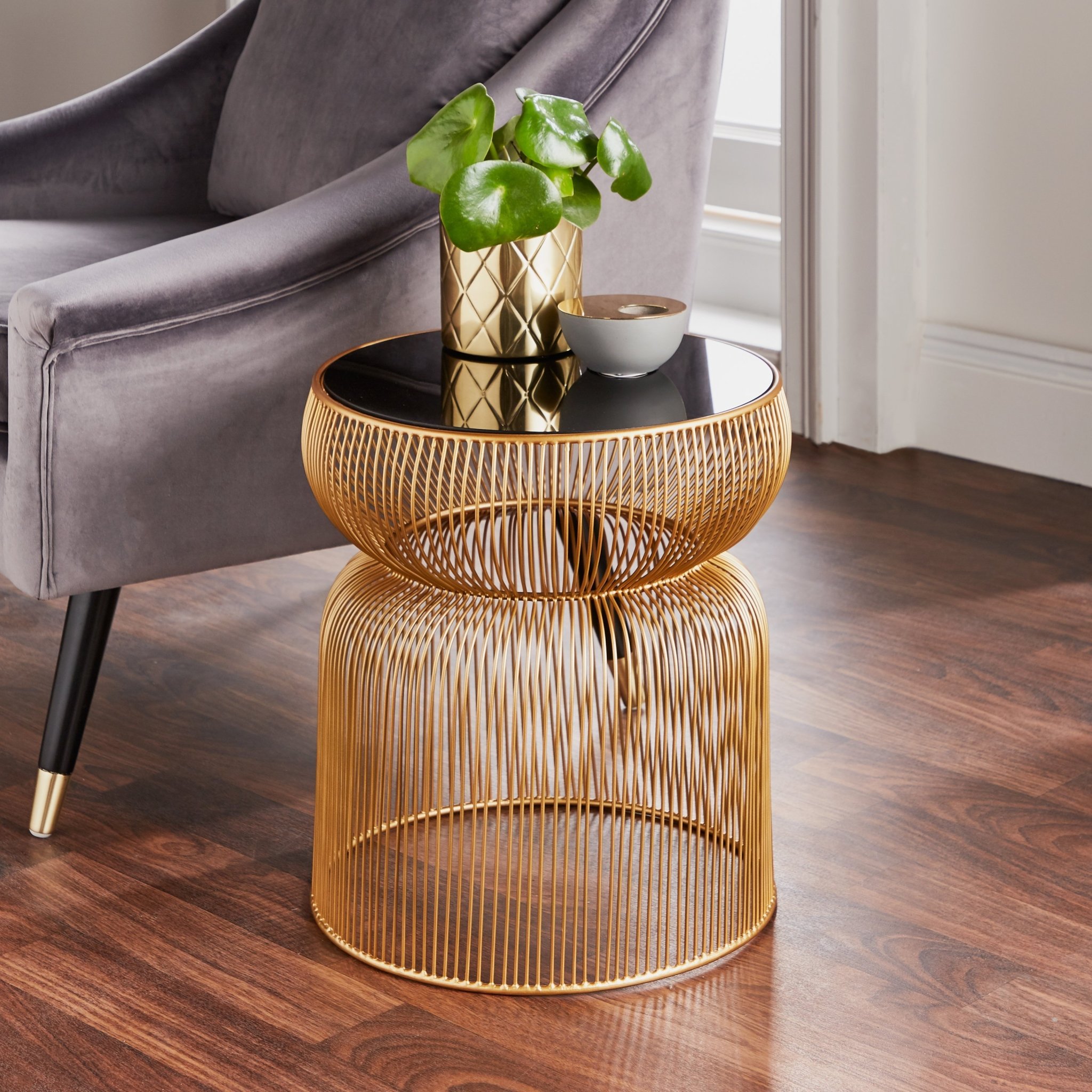 This Gold curve side table will create a luxe feel with its metal wire base ensuring a bang on-trend look along with its sleek black tinted glass. It will make an excellent addition to any lounge space and is the perfect place to hold any accessory or your cup of tea.