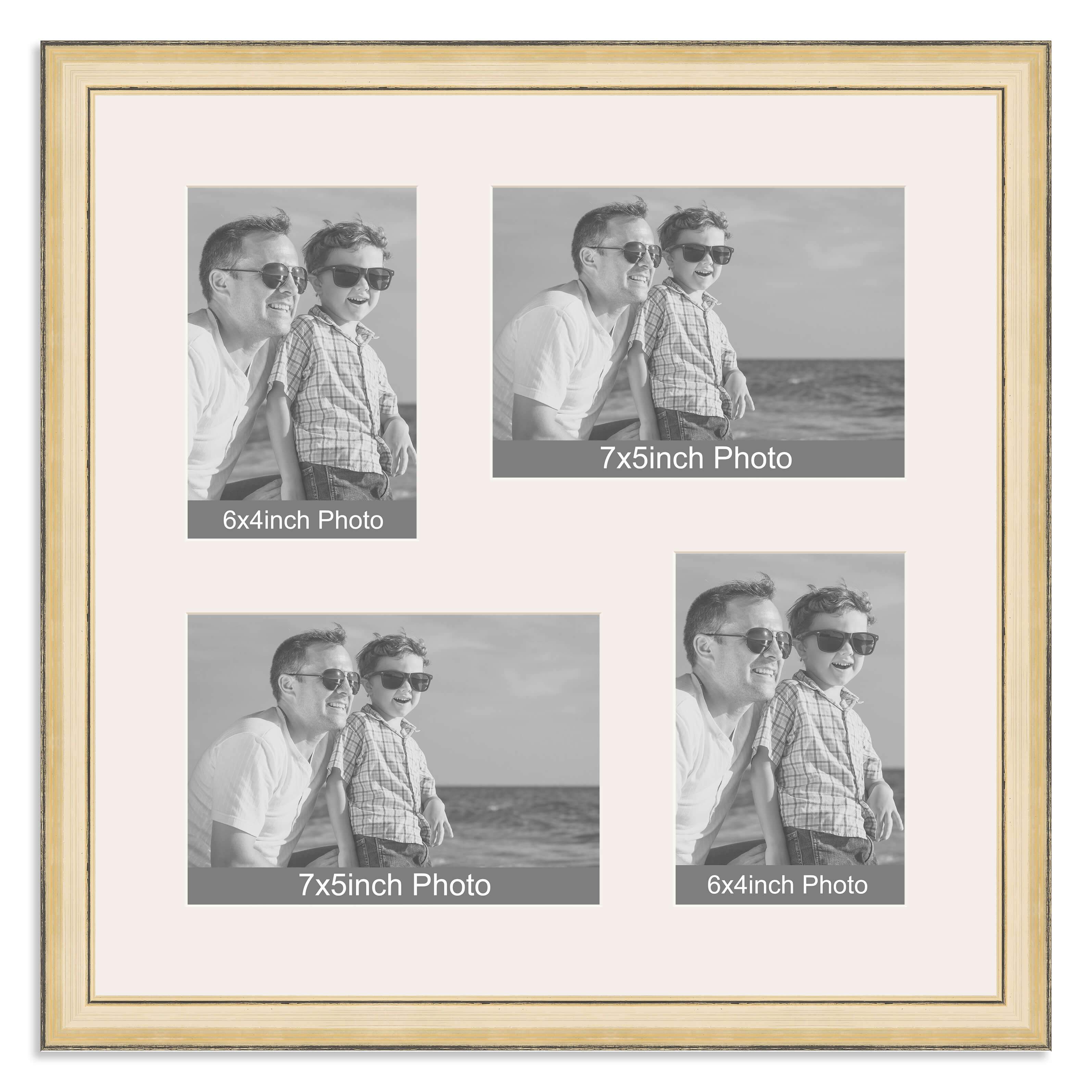 This Photo Frame comes with a contemporary 23mm wide distressed Gold wooden frame, and is supplied with a complementary off white mount to hold two 7x5inch and two 6x4inch photos. Supplied with clear picture glass, MDF backing and hanging hardware.The 15x15inch distressed Gold Photo Frame is perfect for displaying two 7x5inch landscape and two 6x4inch portrait photos or two 7x5inch portrait and two 6x4in landscape photos in any home or office environment.FeaturesDistressed Gold finishWooden FrameOff White MountAccommodates 2x 7x5inch and 2x 6x4inch photosApprox. finished size is 421 x 421mmComes with 2mm picture glass as standardSupplied ready to hang, all you need to supply is the fixing for the wallSKU 052/GLDParcel size: Large