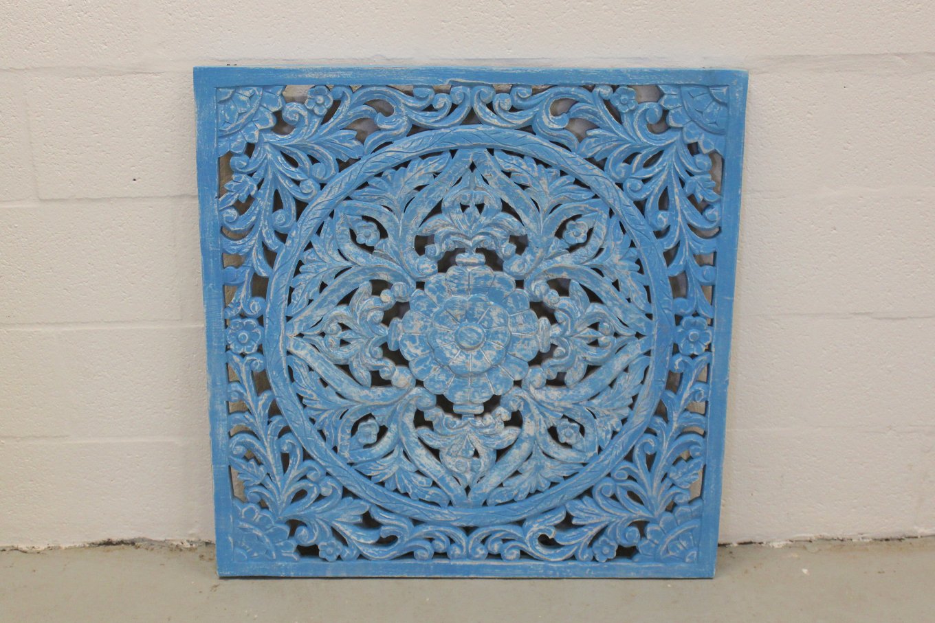 This stunning wall panel is a true work of art. The wood has been artfully carved to show a symmetrical floral pattern designed around the central flower. The distressed blue colour is vibrant, giving the panel an unmistakeable presence, this is a piece of decor that will draw admiring glances! Our Hamesha range embodies the skilled craftsmanship of the artisans who have been intricately carving wood going back many centuries. This eastern inspired collection is designed to bring awe and intrigue to your home.