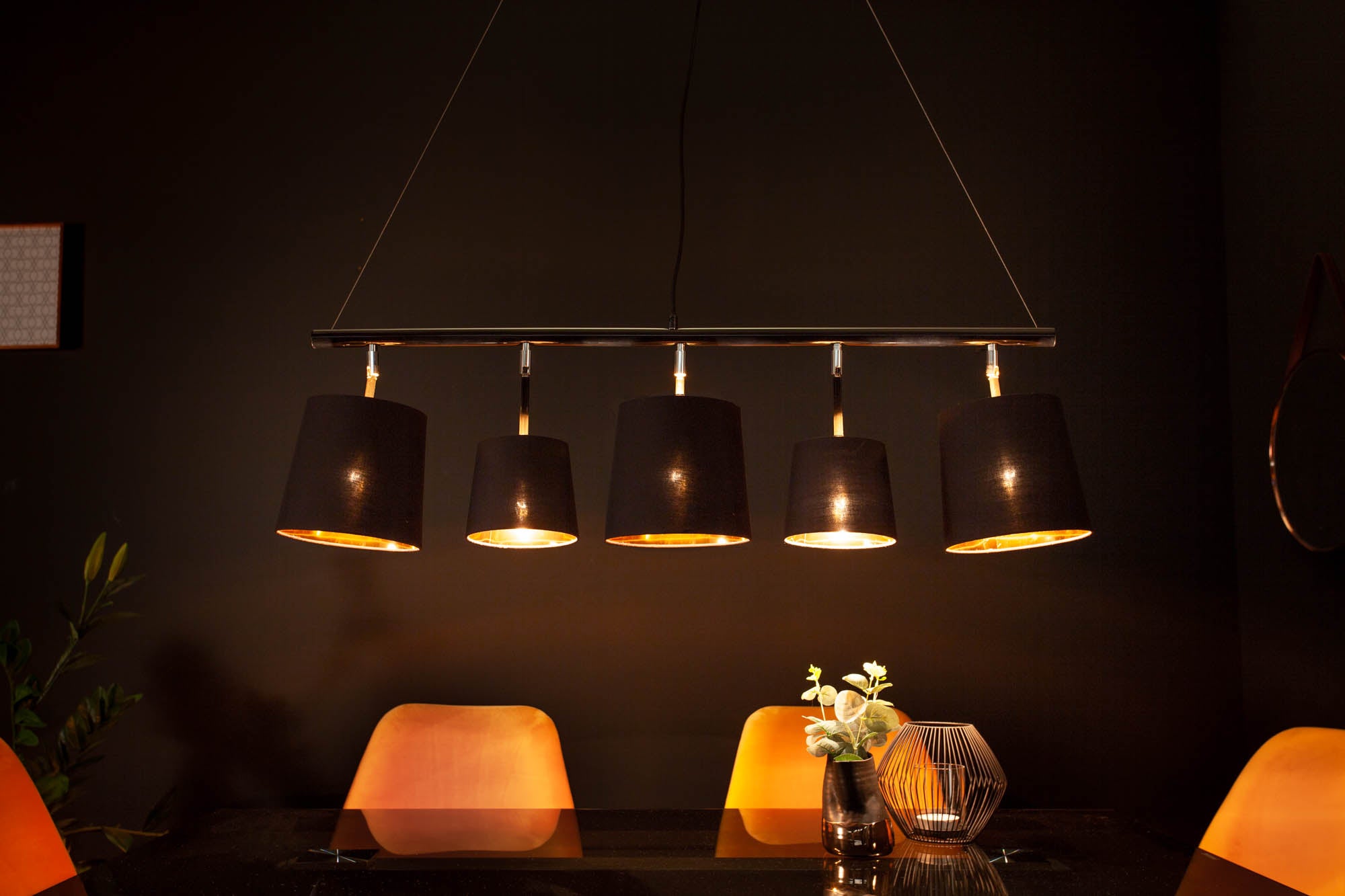 Take a closer look at this modern item of lighting! The five lampshades made of high-quality linen in gold and black give the lamp an elegant and timeless look. It can be combined with other furniture styles.Thanks to the combination of black fitting and the black fabric of the lampshades, you can hang it over any dining table. Warm light shines through the dark linen, which will make the dining experience a cosy moment. Light bulbs not included