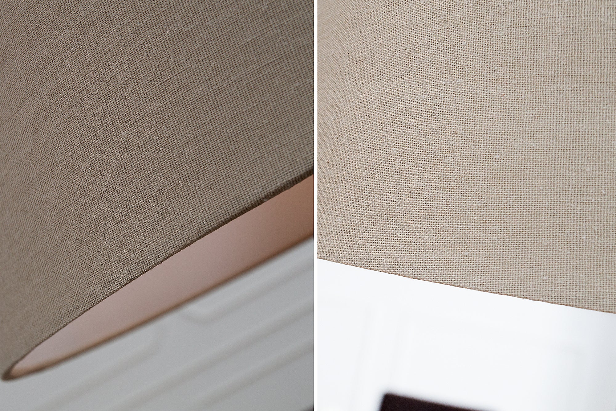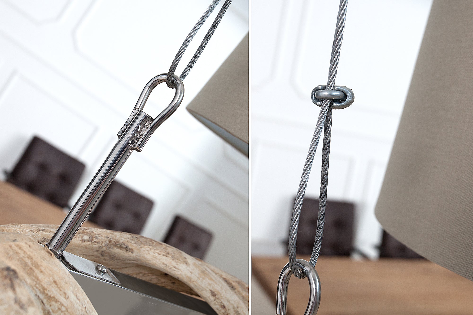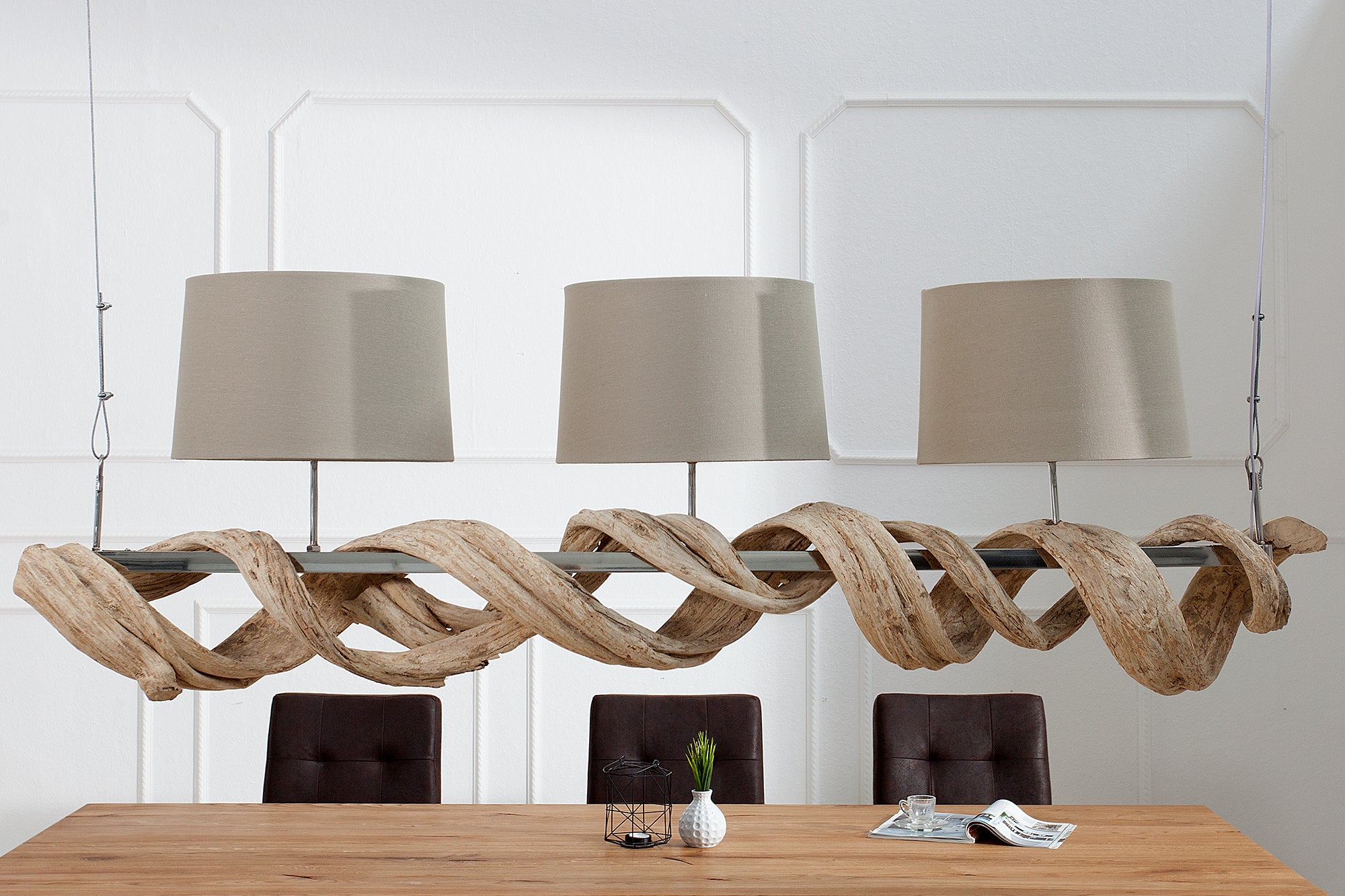 Complement your interior with an extraordinary hanging lamp made of high-quality solid grapevine wood. The three round shades are made of high-quality linen casting warm relaxing light. Light bulbs not included