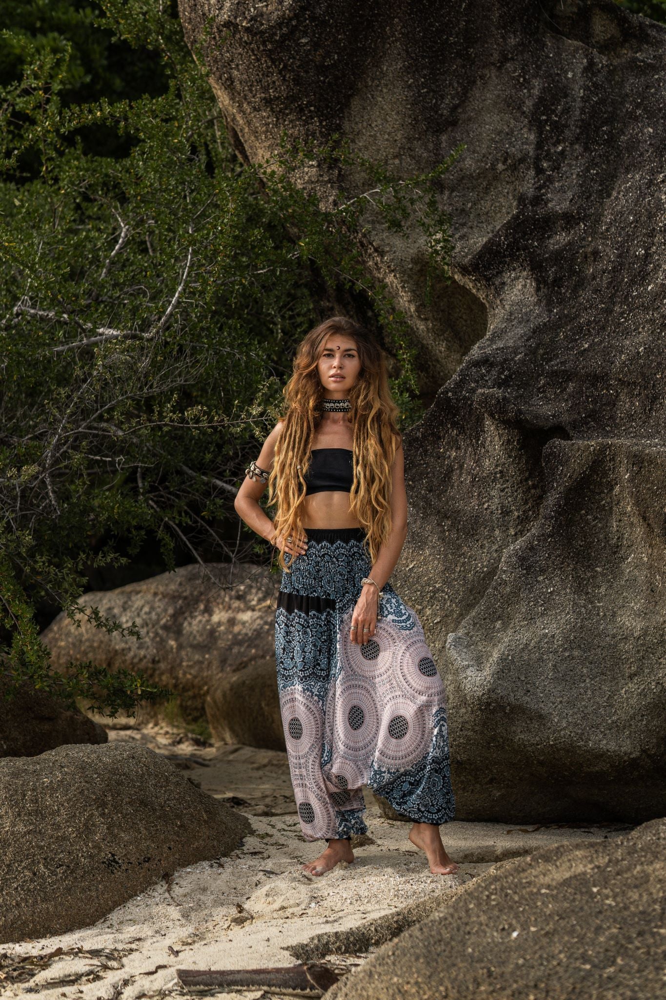 These mandala print harem pants are made from Thai Rayon so they’re super light and comfortable. They have an elasticated waistband for maximum comfort and are elasticated around the ankles so the leg length is adaptable.