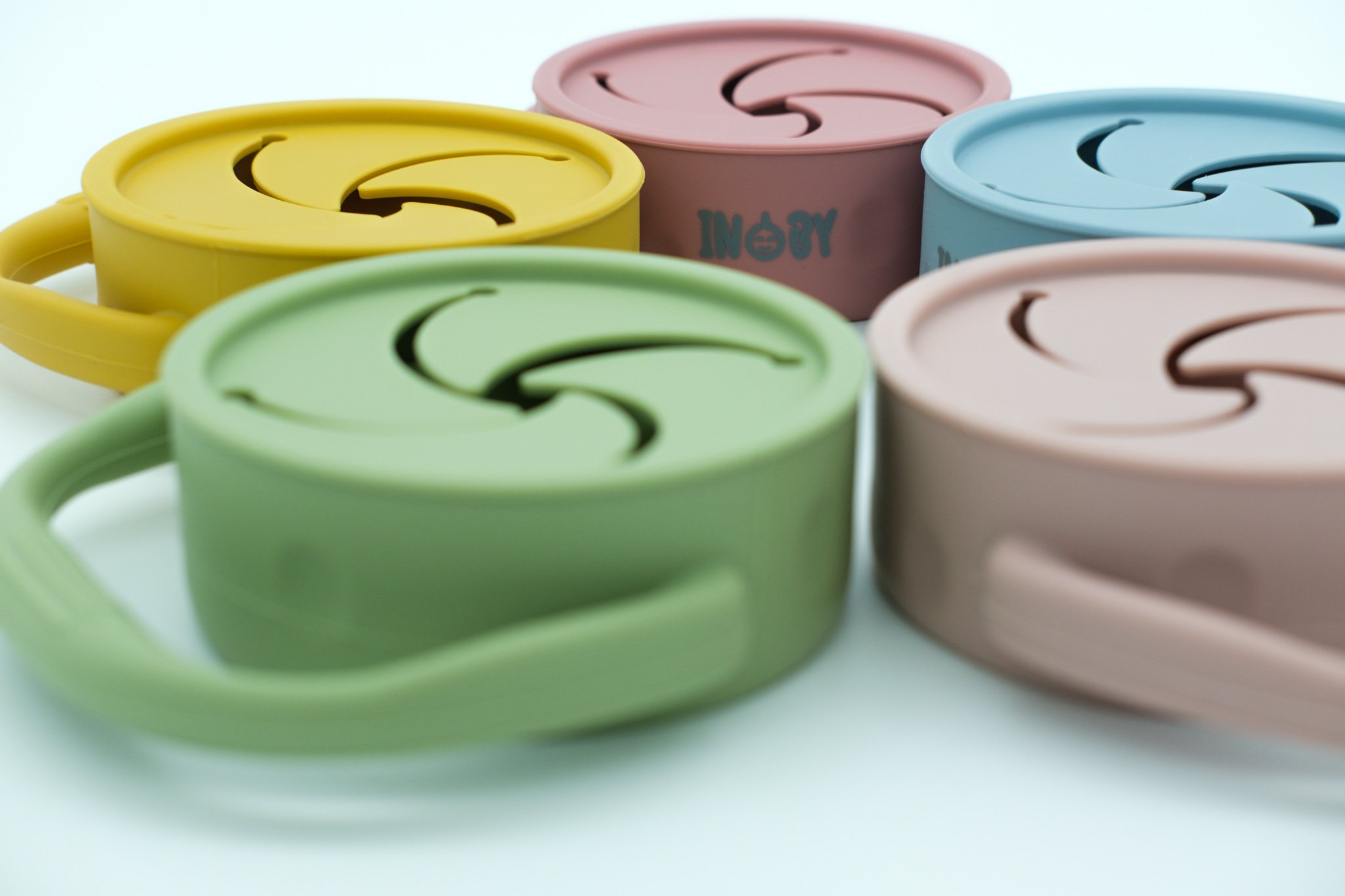 Bring on the snack, without the mess! The INOBY silicone snack cup is a must-have for babies or toddlers on the move. The smart collapsible design makes it easy to store and transport. The soft opening ensures baby’s hands can slide easily in and out, while keeping food securely inside. The sturdy yet soft handle makes an easy grip for little hands. It also comes with a lid to prevent snacks from falling out and unwanted items from going in. Our silicone products are made of food grade silicone, BPA-free, PVC-free, lead-free, and phthalate-free with no biologically harmful chemical materials. Dishwasher, oven and microwave safe. Silicone has a natural resistance to bacteria, making it safe and hygienic The entire weaning set meets FDA approval & strict LFGB EU safety testing standards. Included: 1 silicone snack pot