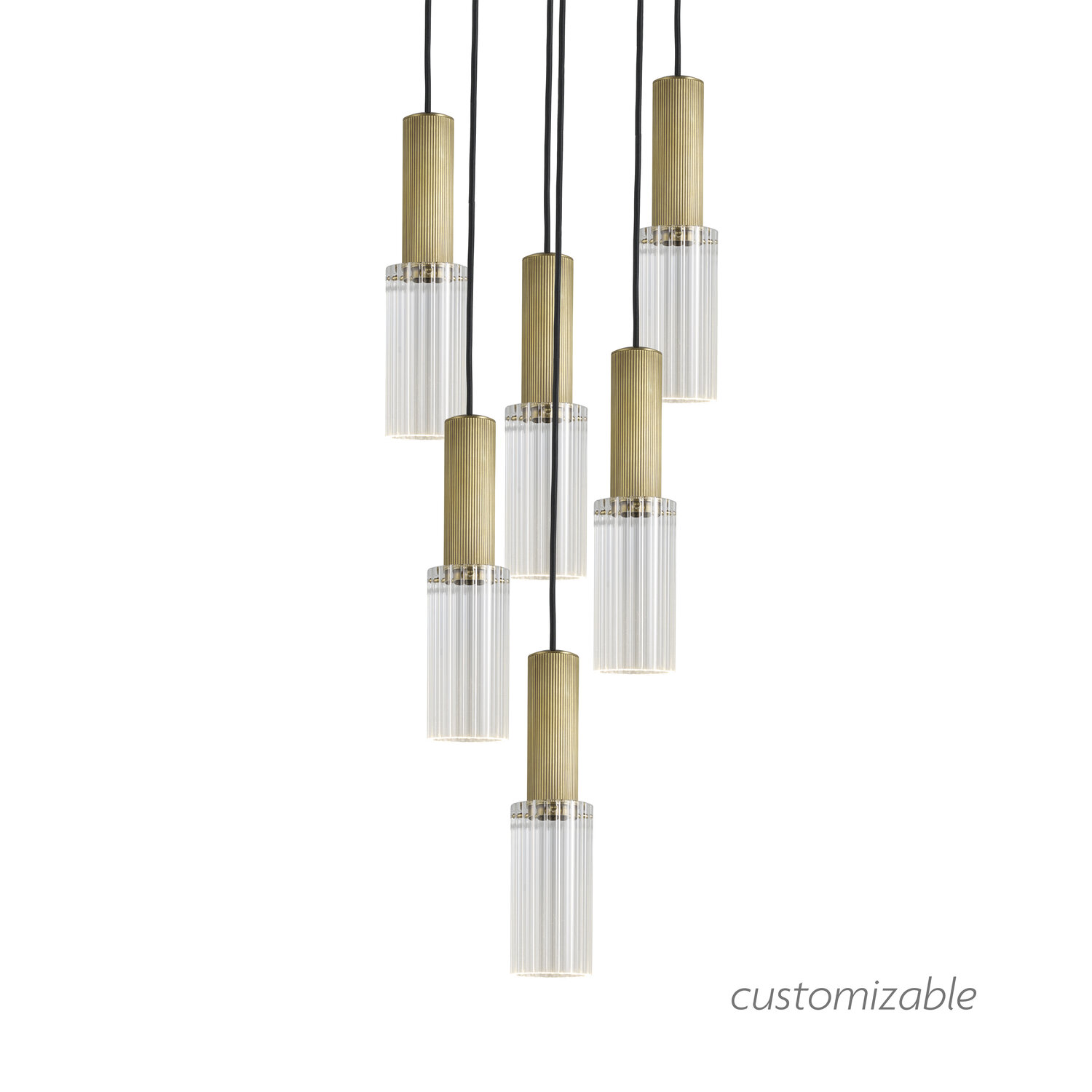 A grouping of six Flume 80 Pendant lights. Each Flume 80 drop features an elegant reeded brass body in antique or bronze finish and a clear reeded glass 80mm diameter shade. The LED light source appears to be invisible as it is recessed inside the body, with the clear glass refracting its light to provide warm illumination with no glare. The height of each drop can be adjusted prior to installation to stagger the lights as desired.