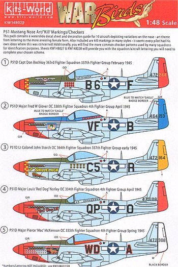 Kits-World 1/48 P-51B/C/D Mustang American Nose Art # 48029 This decal sheet includes 10 aircraft P51 Mustang "Nose Art" schemes including "Kill" markings in many styles – it seems every pilot has his own idea where this was concerned. Additionally, you will also find on the sheet the more common checker patterns used by many squadrons for identification purposes. Red Dog XII, Shillelagh, Happy Jacks Go Buggy, Heat Wave, Ridge Runner, Pin-up Girl, Missouri Mauler, Louisiana Heatwave, Fw Glover, LT 'Moon' Mullins, Capt.D.H.Brochkay