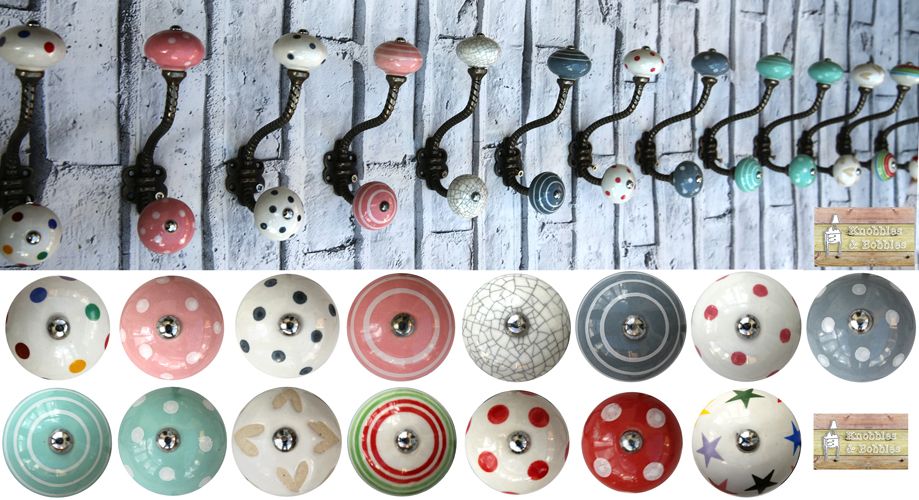 This is Knobbles and Bobbles’ pretty gunmetal coloured hook with a twisted design and choice of knobs.Each hook (complete with ceramic heads) measures 15.5cm in height and will stand 10cm proud of the wall. The ceramic knobs are approximately 4cm in diameter. Price shown is per hook (with two ceramic knobs fitted). **PLEASE NOTE**You can choose from most of our full range of knobs to put on these hooks – we tried to put all the options on this page but our website nearly collapsed! Please contact us if you would like a different combination.Please contact us with any questions; lucy@knobblesandbobbles.com or 07746 357625. Knobbles & Bobbles – Gunmetal Shabby Chic Hooks – Eau De Nil Dot – Multi Coloured / Grey / Pale Green – Dot Pattern – Metal / Ceramic – 15.5 x 10cm – Variant 9635