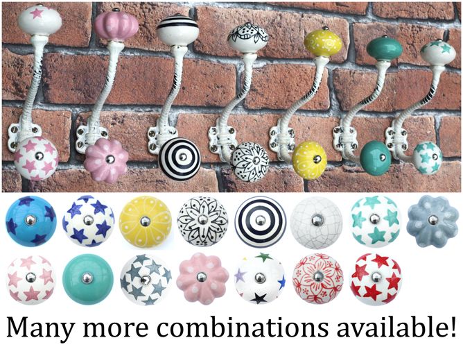Beautiful iron hooks in a white painted, shabby chic finish, with a choice of ceramic knobs. Knobbles & Bobbles – Painted Shabby Chic Hooks – White / Turquoise / Blue – Star Pattern – Iron / Ceramic – Variant 10576