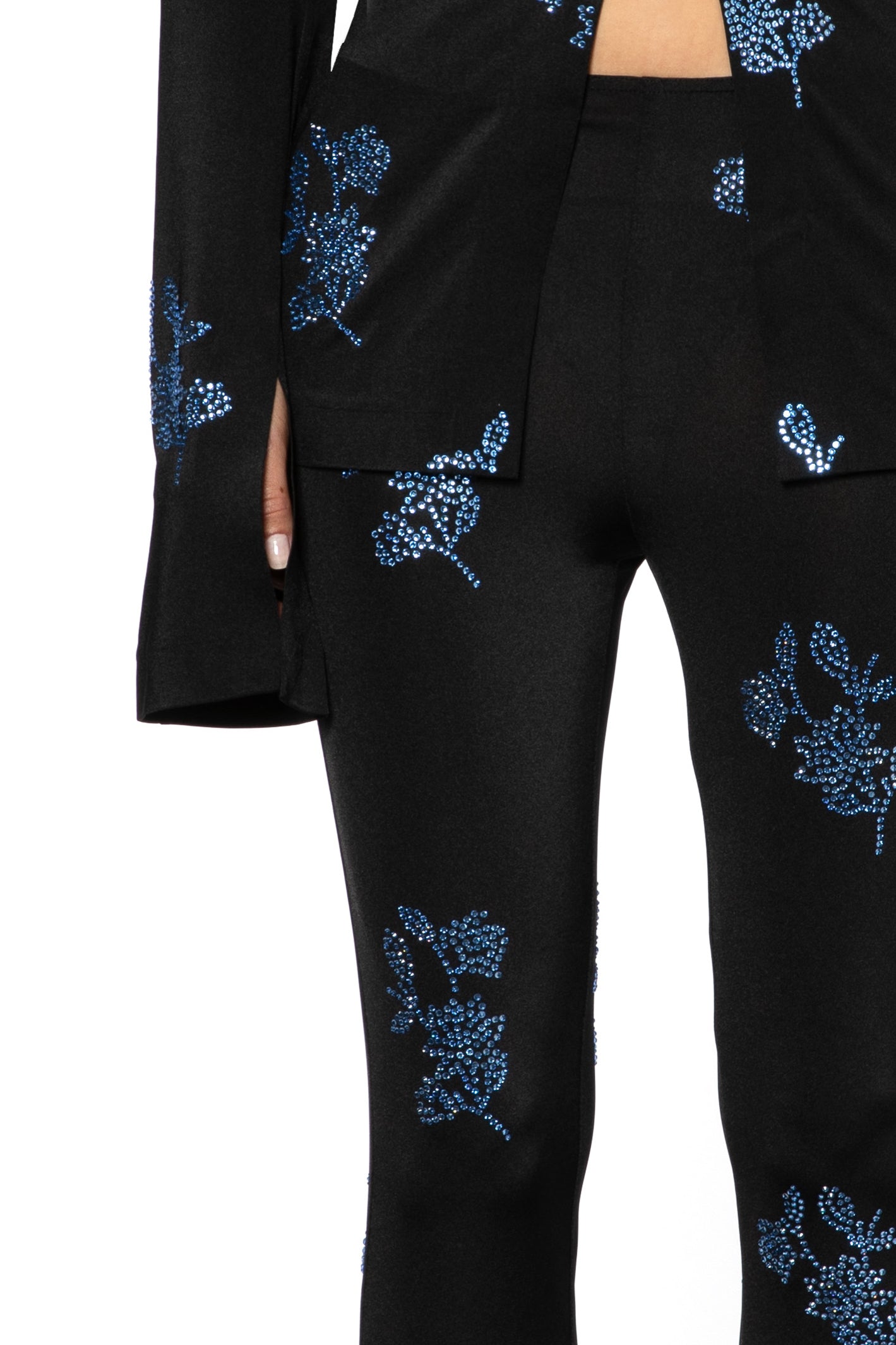 THE KORO TROUSER IN BLACK WITH BLUE CRYSTALS FEATURES A SIGNATURE 16ARLINGTON FLARED LEG AND EMBELLISHED WITH ALL OVER HOTFIX FLORAL MOTIFS IN A BLUE CRYSTAL . IT IS CUT IN A SLIM FIT WITH A SLIGHT STRETCH AND IS FASTENED WITH A ZIP ON THE SIDE. PAIR WITH THE MATCHING OPALA SHIRT.