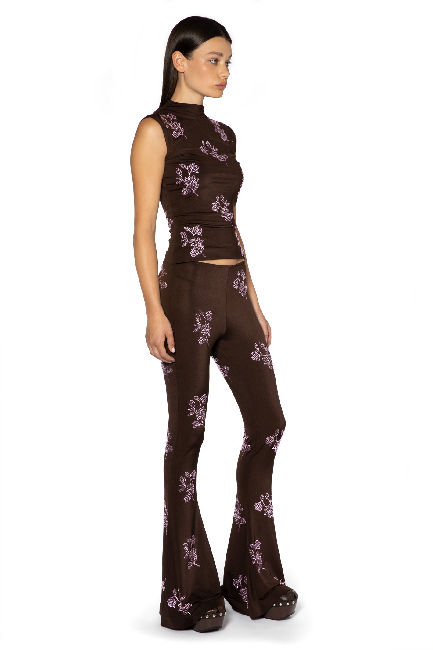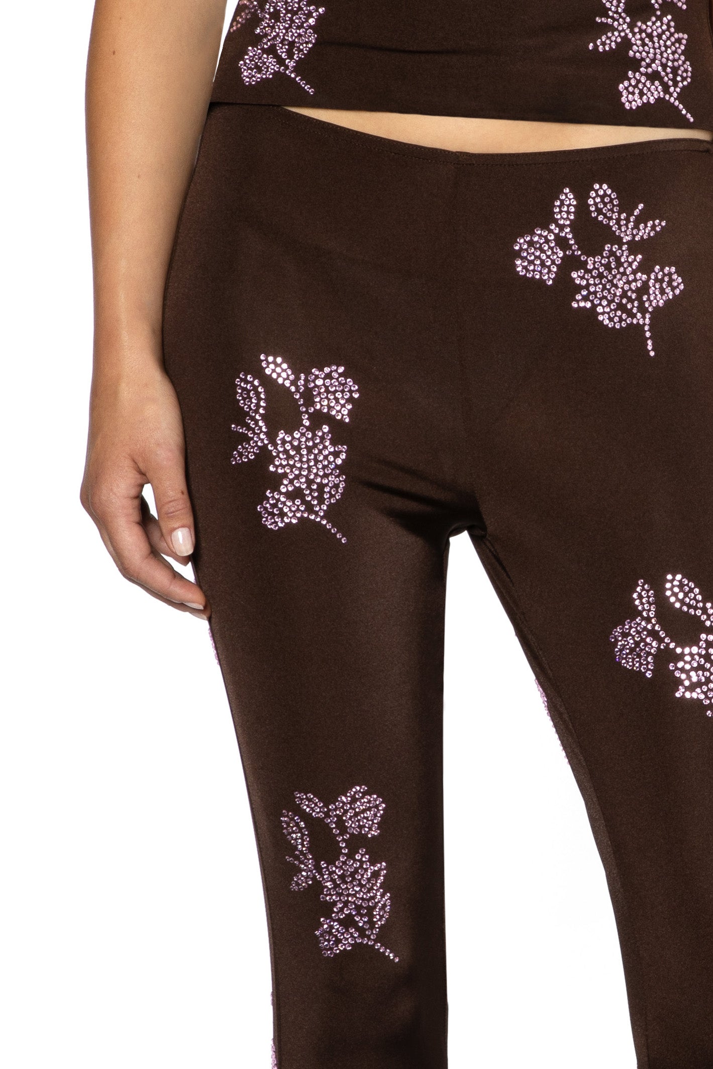 THE KORO TROUSER IN BROWN WITH PINK CRYSTALS FEATURES A SIGNATURE 16ARLINGTON FLARED LEG Â AND EMBELLISHED WITH ALL OVER HOTFIX FLORAL MOTIFS IN A PINK CRYSTAL . IT IS CUT IN A SLIM FIT WITH A SLIGHT STRETCH AND IS FASTENED WITH A ZIP ON THE SIDE. PAIR WITH THE MATCHING OPALA SHIRT OR TANIA TOP.