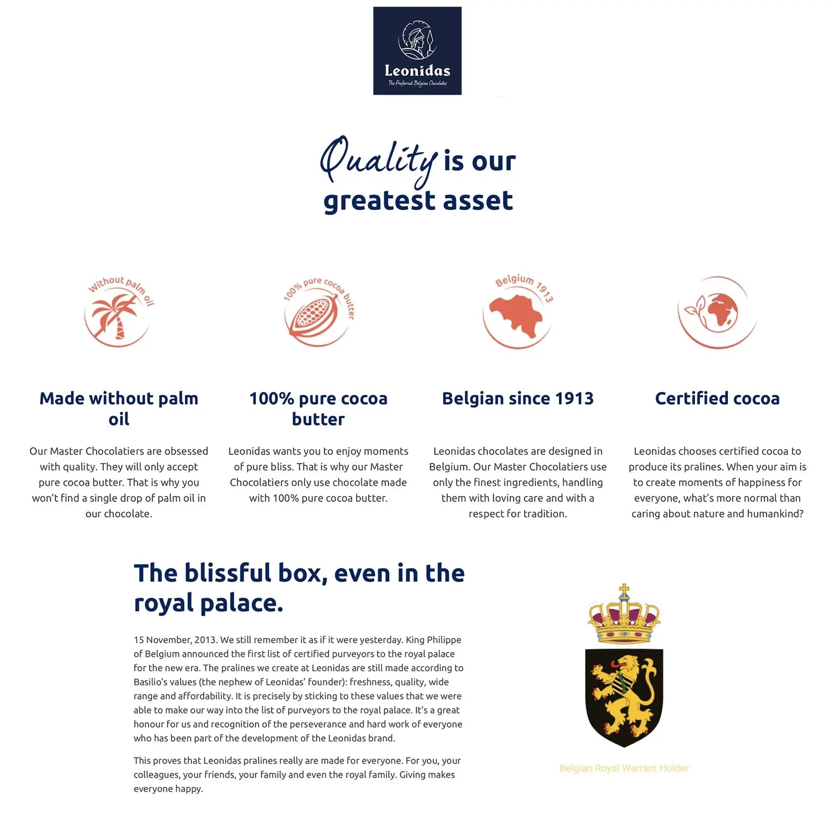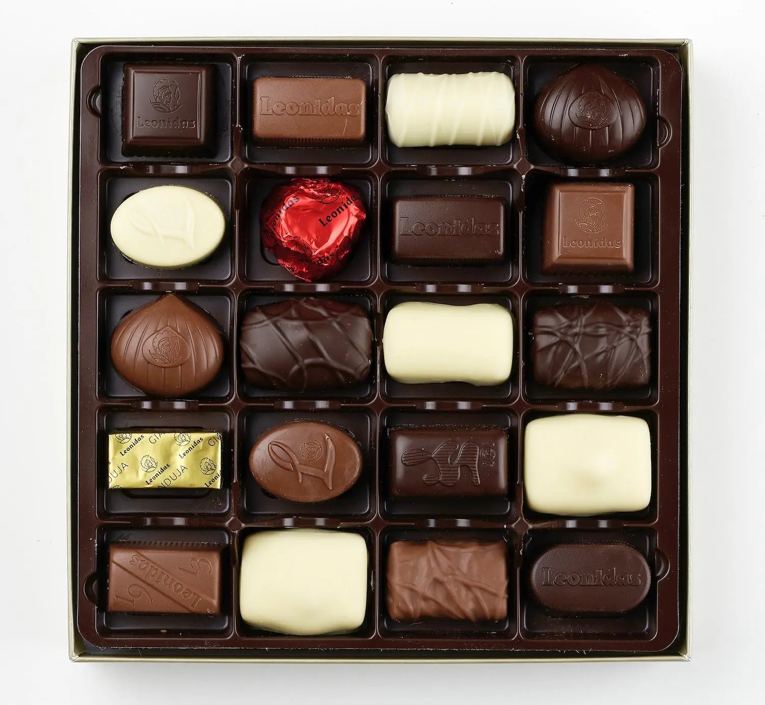 Single layer Heritage Santiago box with 16 assorted pieces Assorted Milk, Dark & White chocolate; Leonidas Chocolate is made with high quality cocoa beans, ground finely and only fresh and natural ingredients; Leonidas chooses certified cocoa to produce its pralines. When your aim is to create moments of happiness for everyone, what’s more normal than caring about nature and humankind? 100% Pure cocoa butter, No palm oil; Keep cool and dry between 15 °C and 18 °C. Each comes luxury ribboned free of charge. Colours of ribbon may vary. For a custom selection or variety and details, please contact us: 0207 938 3159 – Leonidas Single Layer Heritage, 16 Assorted Praline, Butter Creams, Truffles, Marzipan & Ganache 16 pc / Milk, White and Dark