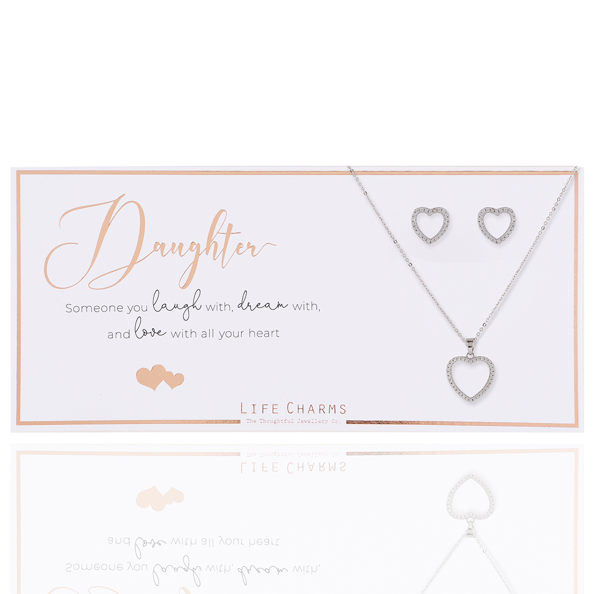 Beautiful set of pendant necklace and stud earrings, both in a diamante-encrusted open heart design. This sweet set comes presented on a card with rose gold foil accents and “Daughter” saying and includes a luxury gift box to make a perfect gift.