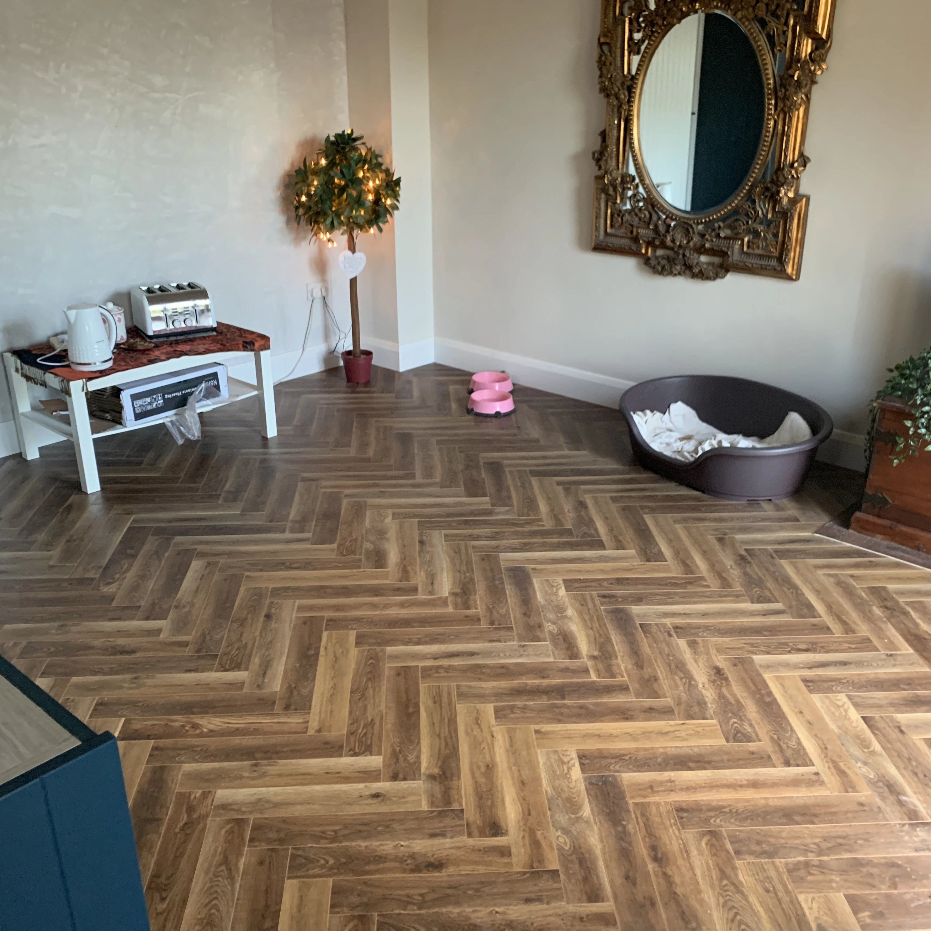 Specification: Lightly Smoked Oak Herringbone Laminate – 12mm – Water & Scratch Resistant – Wood Floor Store