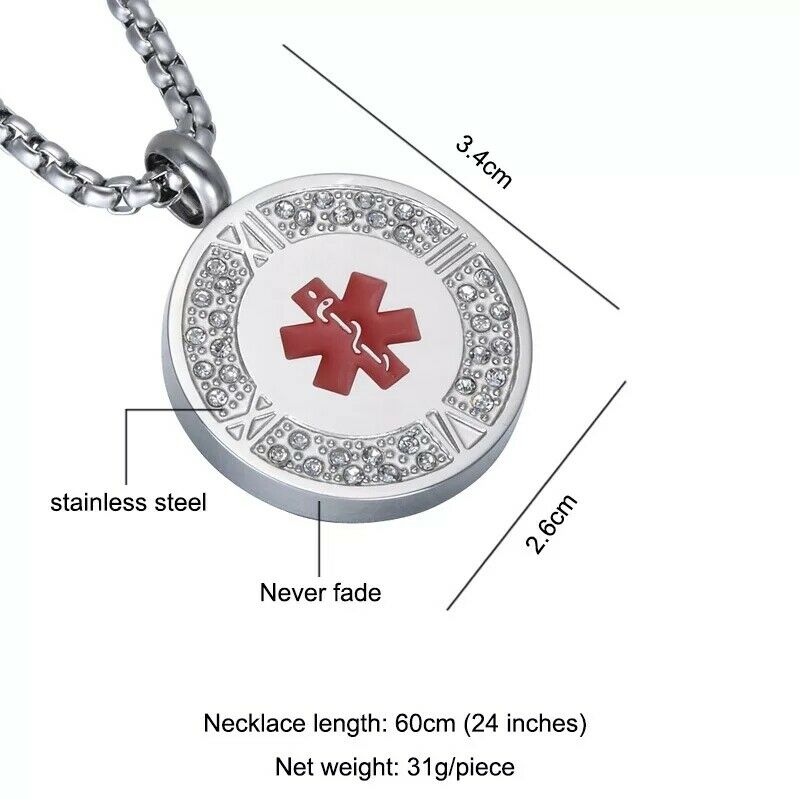 The Lotus necklace has a beautiful pendant with scattered diamantés and ample space for engraving on the rear. This customisable medical alert ID necklace is perfect for every day wear and elegant enough to wear on an evening out. Product Features: Style/Shape: PendantChain Length: 60cm Pendant: 3.4cm x 2.6cmMaterial: Stainless Steel Engraving Maximum of 4 lines with 20 characters maximum per line.Ensure you include any capital letters where you would like them as the text will be copied exactly as it has been provided. Please note that the more lines / letters added may result in the text to decrease in size. Customised jewellery cannot be returned unless delivered damaged or faulty. We ask that you ensure that the size is correct to your needs.