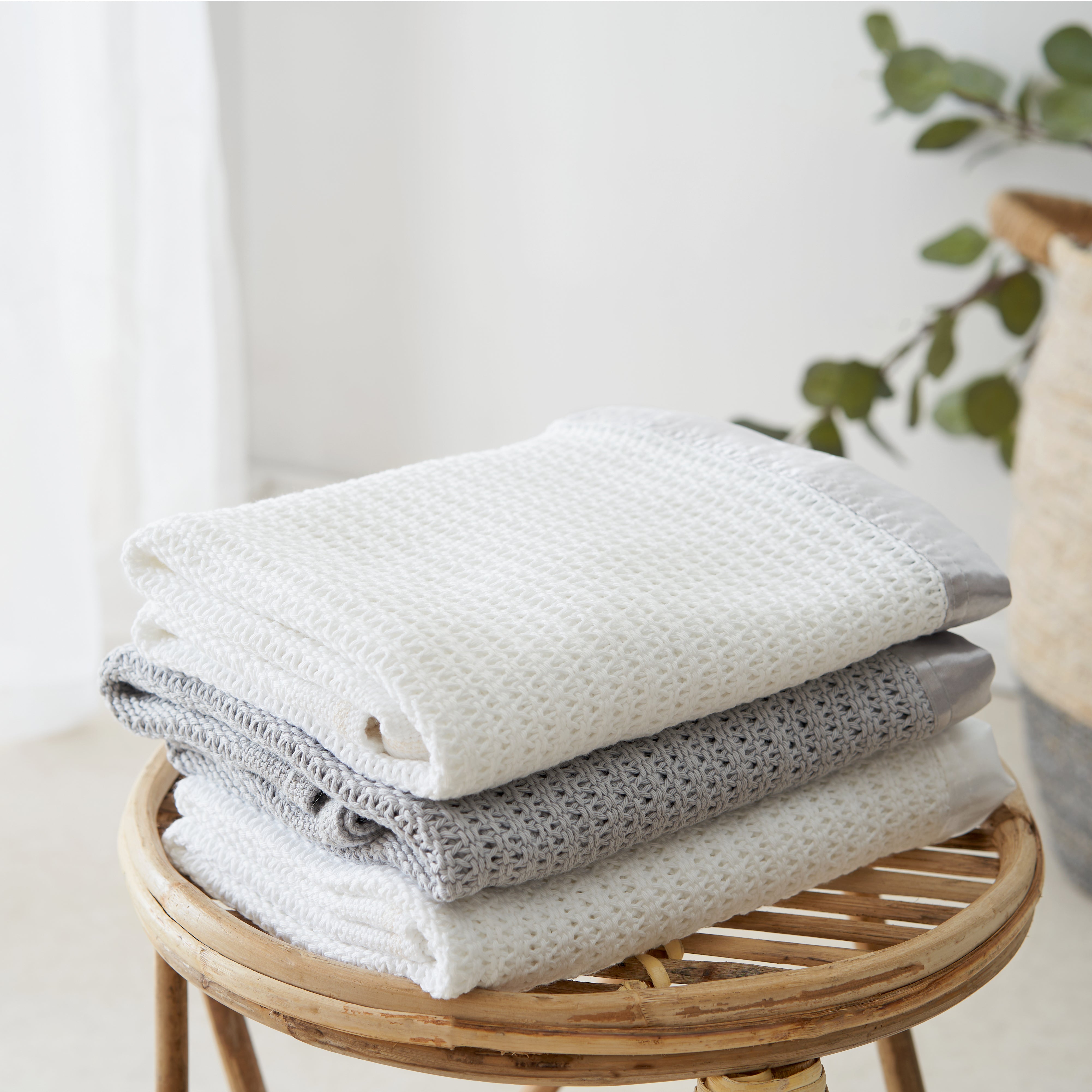 The Tiny Bed Company’s luxury cellular blanket is crafted using premium 100% certified organic cotton yarn and hand-finished with soft satin edging that your tiny one will love to stroke.This luxurious 100% natural fibre baby blanket uses a unique breathable cell construction to trap air – keeping your baby cool in the summer months and warm during winter. Our bespoke, lightweight cellular blanket is lovingly designed and crafted using the finest natural materials in the UK. It’s soft and kind on babies’ skin and designed to last wash after wash.Our Tiny DifferenceWe use responsibly sourced 100% organic cotton yarn that is knitted and dyed in England before being specially crafted into our velvety soft cellular blankets.Choose from three soothing nursery colours: White & Grey Satin, White & White Satin, Grey & Grey Satin. DIMENSIONS: 90cm x 70cm