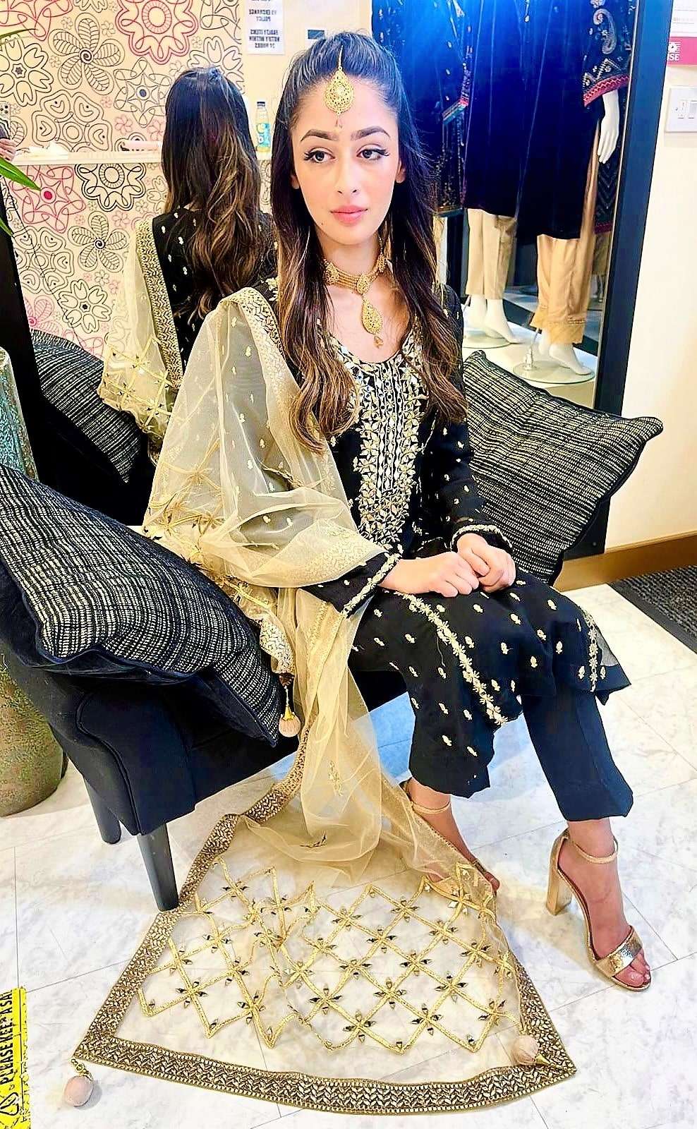 Ready to wear 3pc luxury chiffon suit. This is a beautiful elegant black with gold emberoidery and mirrors on shirt. Gold embroidery and mirrors on dupatta. ideal for mehandi/party events. Plain crepe trousers. please note can be purchased with gold sharara for £95 – please message us on instagram to enquire