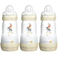 The MAM 260ml triple pack bottles are anti-colic and feature lovely neutral designs and clear measurement markings. Mam bottles are ideal bottle for an easy switch between breast and bottle thanks to the patented Silk teat which is silky soft and provides a familiar feel for babies. Market Research confirmed that 94% of babies accepted the teat making it perfect for when mum wants to be a bit more flexible. Thanks to the innovative vented base there is an even drinking flow so that babies can remain calm and relaxed without swallowing air helping to reduce colic in 80% of cases. The Anti Colic Bottle self-sterilises in 3 easy steps ensuring simple safe bottle cleaning at home or on the go. These bottles can self-sterilise in 3 minutes in a microwave, so is a great choice for feeding on the go. Features:Mam Teat with Skin Soft silicone surface for a familiar feeling – accepted by 94% of babies*Less colic and regurgitation for 80% of babies as a result of the vented base – for relaxed feeding**BPA Free with wide openings for easy filling and cleaningUnique self-sterilising function – ideal for on the go, just 3 minutes in the microwave, no need for separate steriliserPrinted on both sides – clear capacity and stylish themesWhat’s included3 X MAM Anti-Colic Bottles Unisex motif 260ml*Market research 2009-2017, tested with 1.508 babies. **Field study, Austria 2011, tested with 73 mothers of colicky babies / Market research, USA 2010, tested with 35 mothers of colicky babies. MAM Easy Start Anti-Colic Bot The MAM 260ml triple pack bottles are anti-colic and feature lovely neutral designs and clear measurement markings. Mam bottles are ideal bottle for an easy switch between breast and bottle thanks to the patented Silk teat Mam – Easy Start Anti-Colic Bottles – Unisex 260Ml 3 Pack