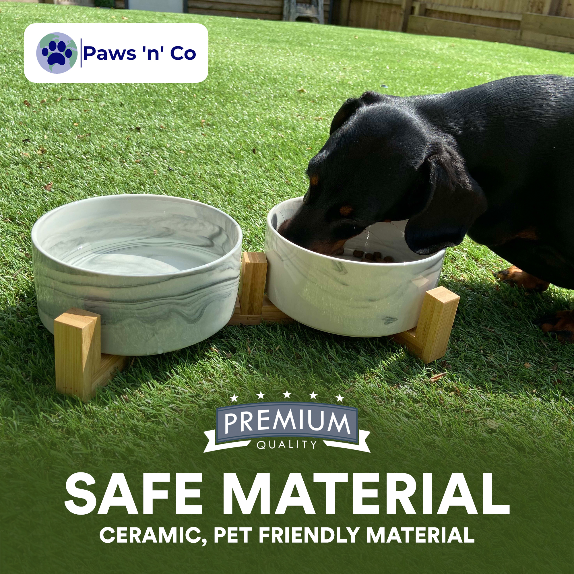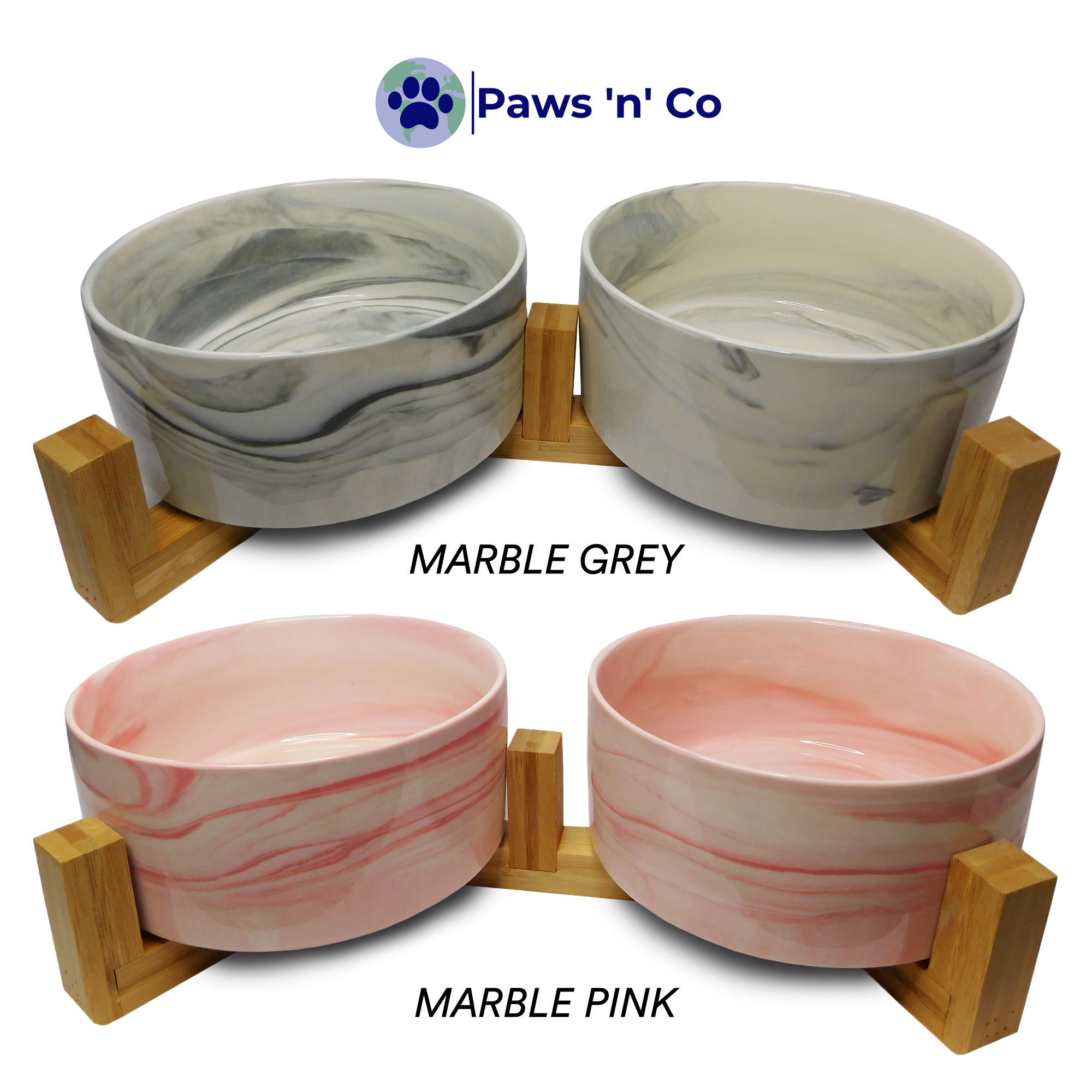 Marble Ceramic Dog bowl with wooden stand – Grey – Paws N Co