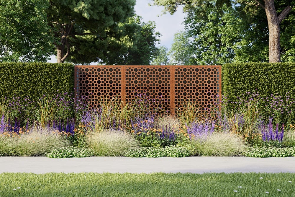 The weathering Corten steel finish to this fence panel creates a raw, textured and natural look.