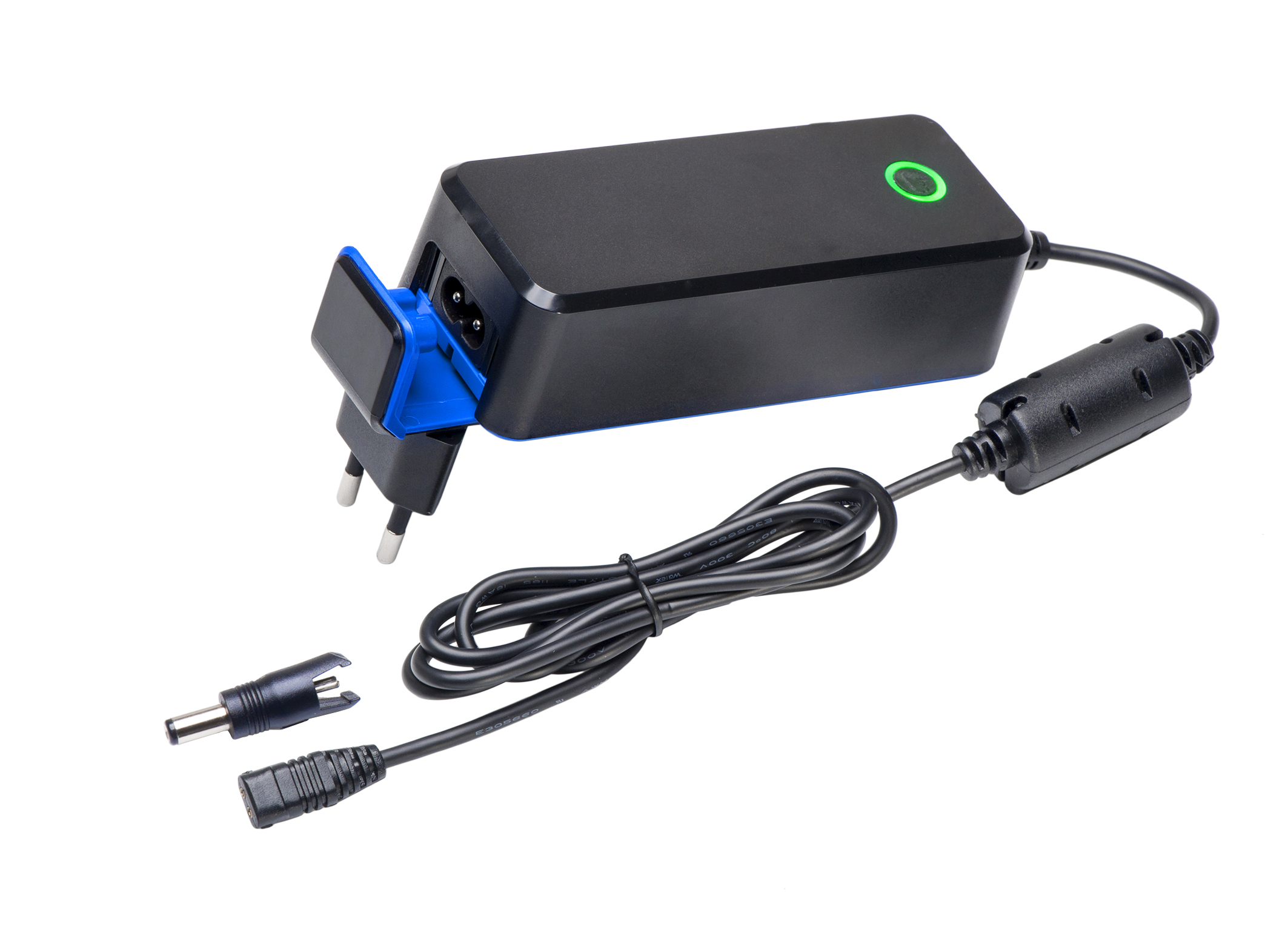 Blueline 3 step Li-Ion Battery Charger with exchangeable AC plug heads, maximum charge Current 2.7A, with current detection as charge termination, a low current start up step for deeply discharged batteries, universal input voltage(90-264VAC), protection against reverse polarity and short circuit and an LED to indicate state of charge.