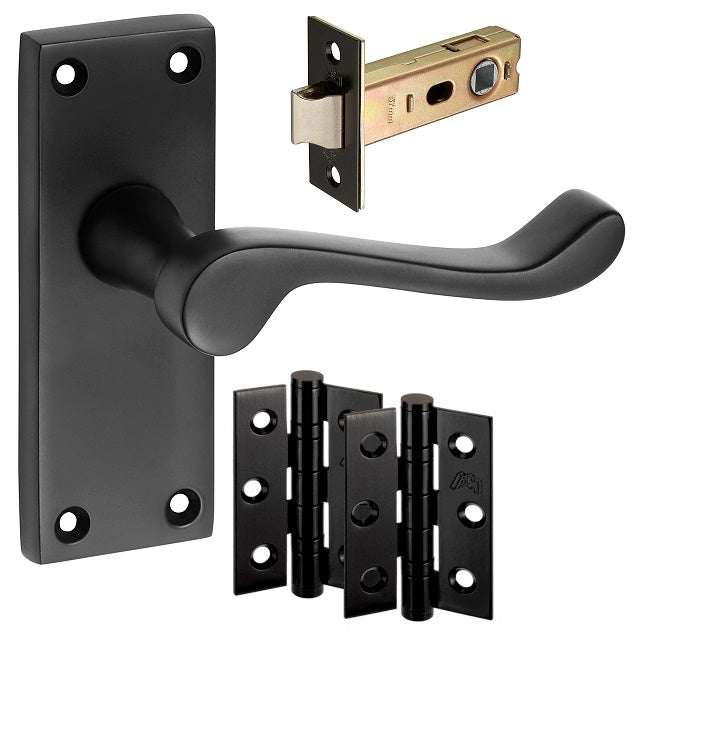 NOW BACK IN STOCK – Matt Black Victorian Scroll Door Handles. As detailed below we now supply these as a complete kit with Matt Black Locks, Matt Black Hinges and Matt Black Latches if required. Available in Latch, Lock & Bathroom. These Matt Black Victorian door handles feature a traditional scroll lever integrated on a rectangular backplate. Dimensions: LATCH 103mm x 41mm Backplate. LOCK & BATHROOM 153mm x 41mm – Thickness 10mm. 97mm Lever Length. SOLD/SUPPLIED IN PAIRS. Matt Black Door Handles are very on-trend and proving extremely popular in the world of ironmongery. Designed to enhance any colour of door in any wood. We also sell mortice latches, bathroom locks, sash locks, and hinges all in Matt Black to complement the handles superbly. We have been overwhelmed by the positive comments since bringing these into stock. See our other Matte Black Door Handles for further designs. PLEASE NOTE DUE TO OVERWHELMING DEMAND WE HAVE NOW MADE THIS DESIGN AVAILABLE AS A COMPLETE DOOR HANDLE PACK, SEE OPTIONS WHEN ORDERING. Supplied as a pair with matching screws and connecting spindle. FOR MATCHING LOCKS, LATCHES AND HINGES PLEASE SEE RELATED PRODUCTS. Aluminum – Matt Black Powder Coated Finish.