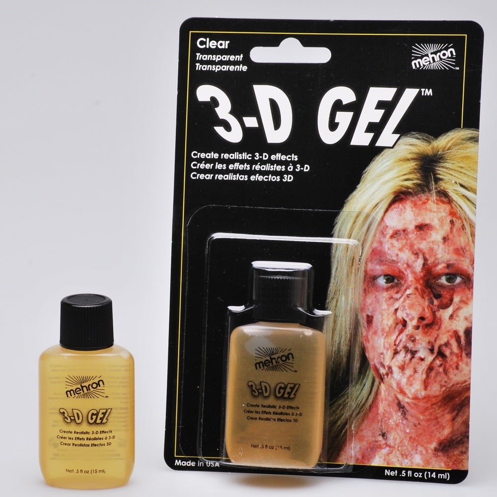 Mehron 3-D Gel is used to create realistic three dimensional special effect additions to a character’s makeup. To use the 3-D Gel just heat it to a liquid form, brush on, allow curing, and carve it up to your delight. There is no adhesive needed when using the 3-D Gel. 3-D Gel removes from skin and hair with warm water. 3-D Gel may be used as a substitute for latex on children.