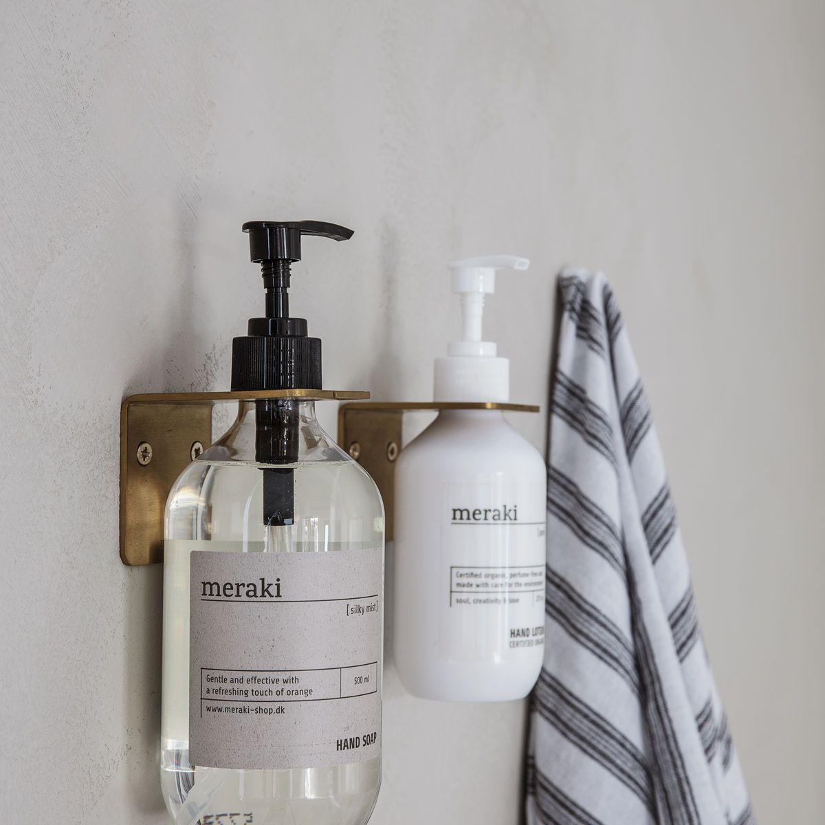 Store your Meraki hand soap with a nice and elegant way with the wall bracket. The wall bracket is made of 100% stainless steel and covered with brushed brass which provides it with a raw and nice look – it will fit perfectly into any home. Measurements: 5,8 cm in length, 6,7 cm in width and 5,8 cm in height.