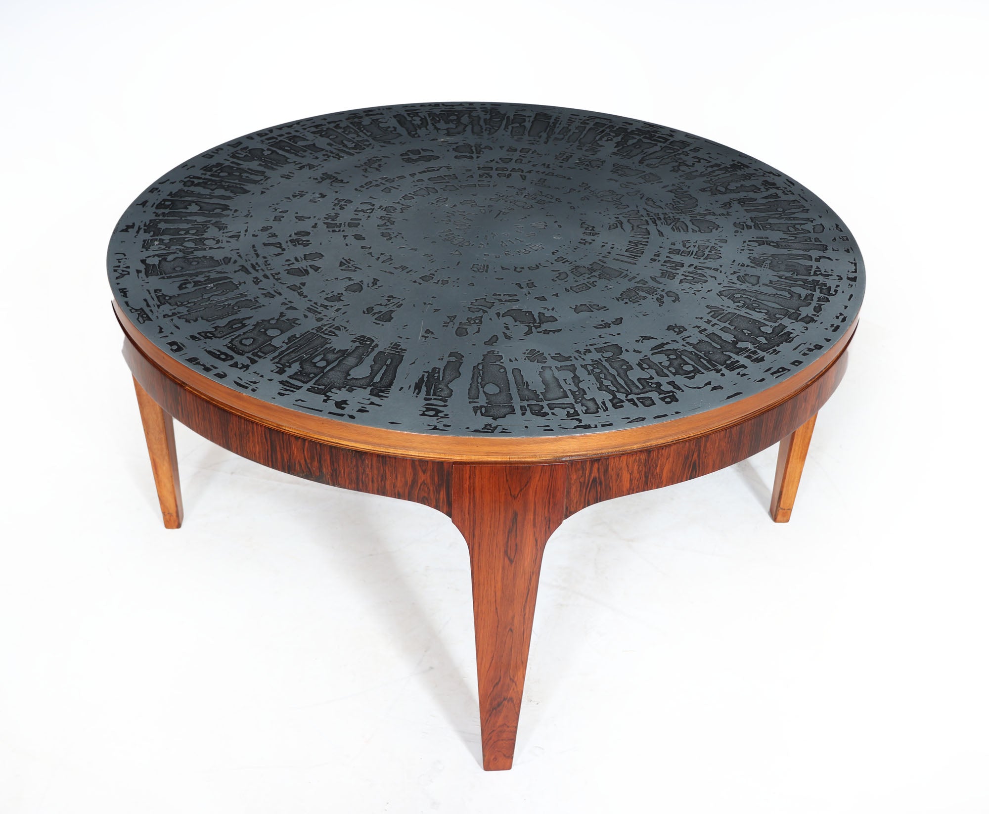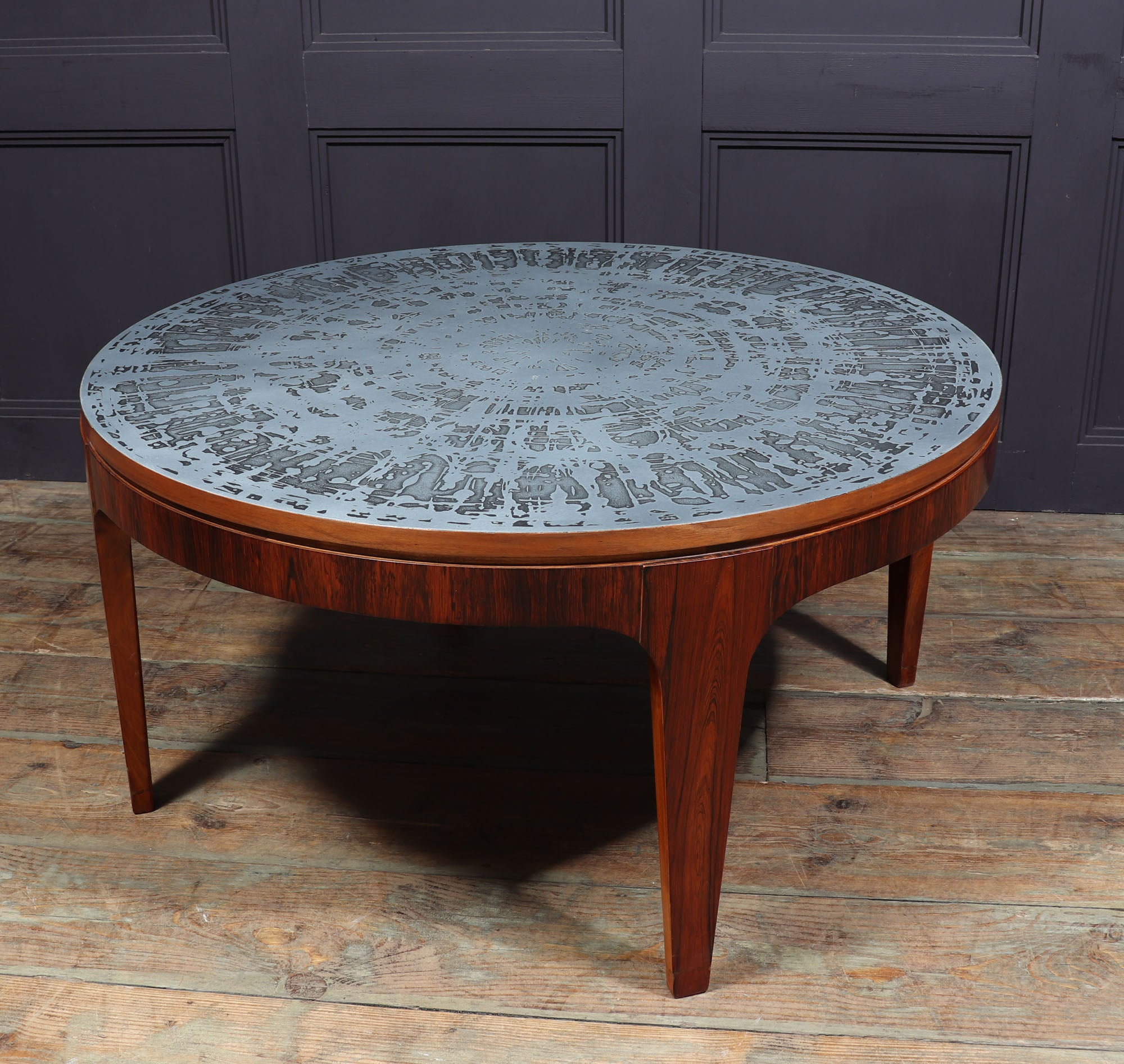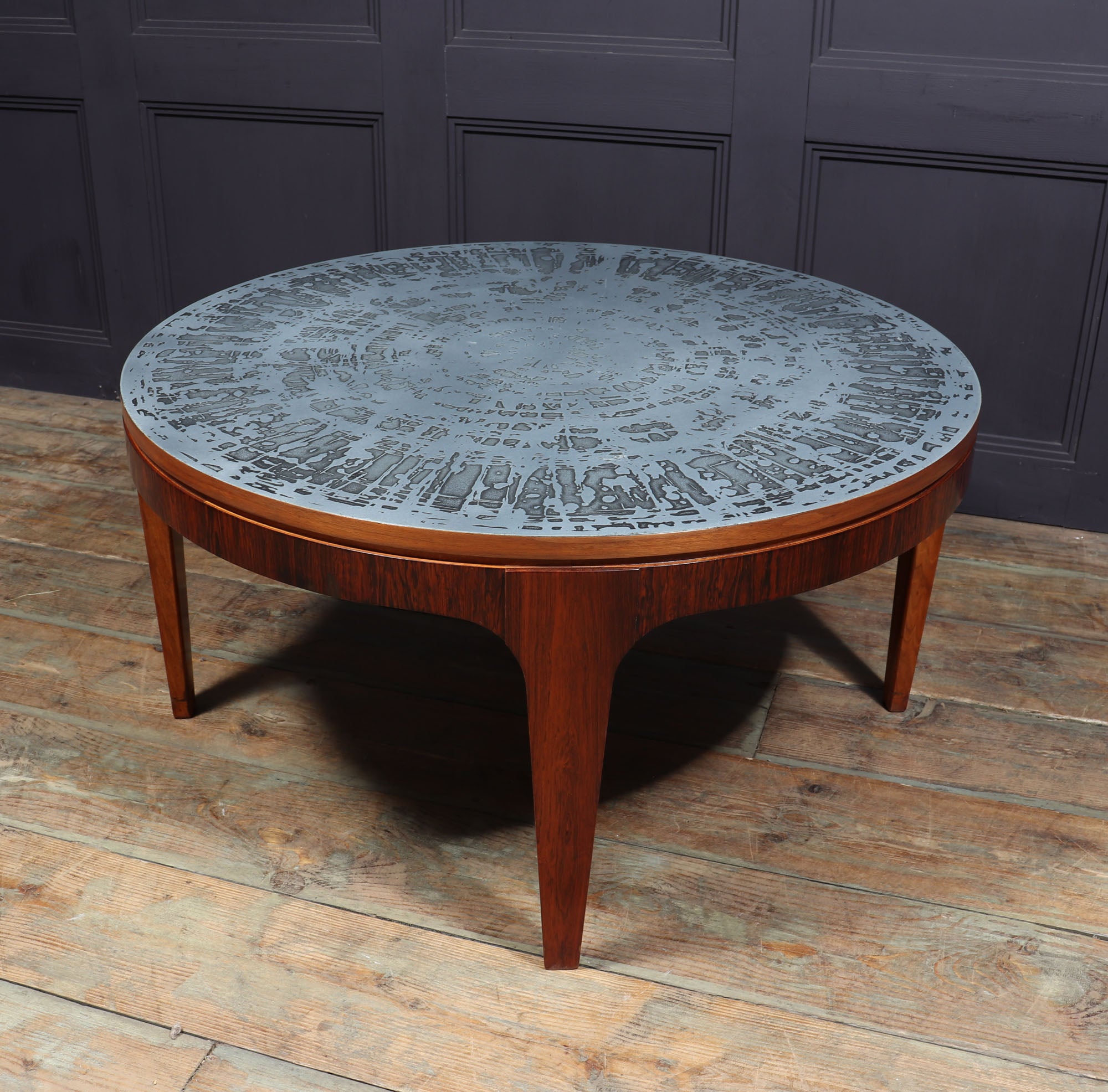 A very stylish Rosewood Scandinavian coffee table with acid etched aluminium top with four legs. The wood has been re finished and the table is in very good condition throughout