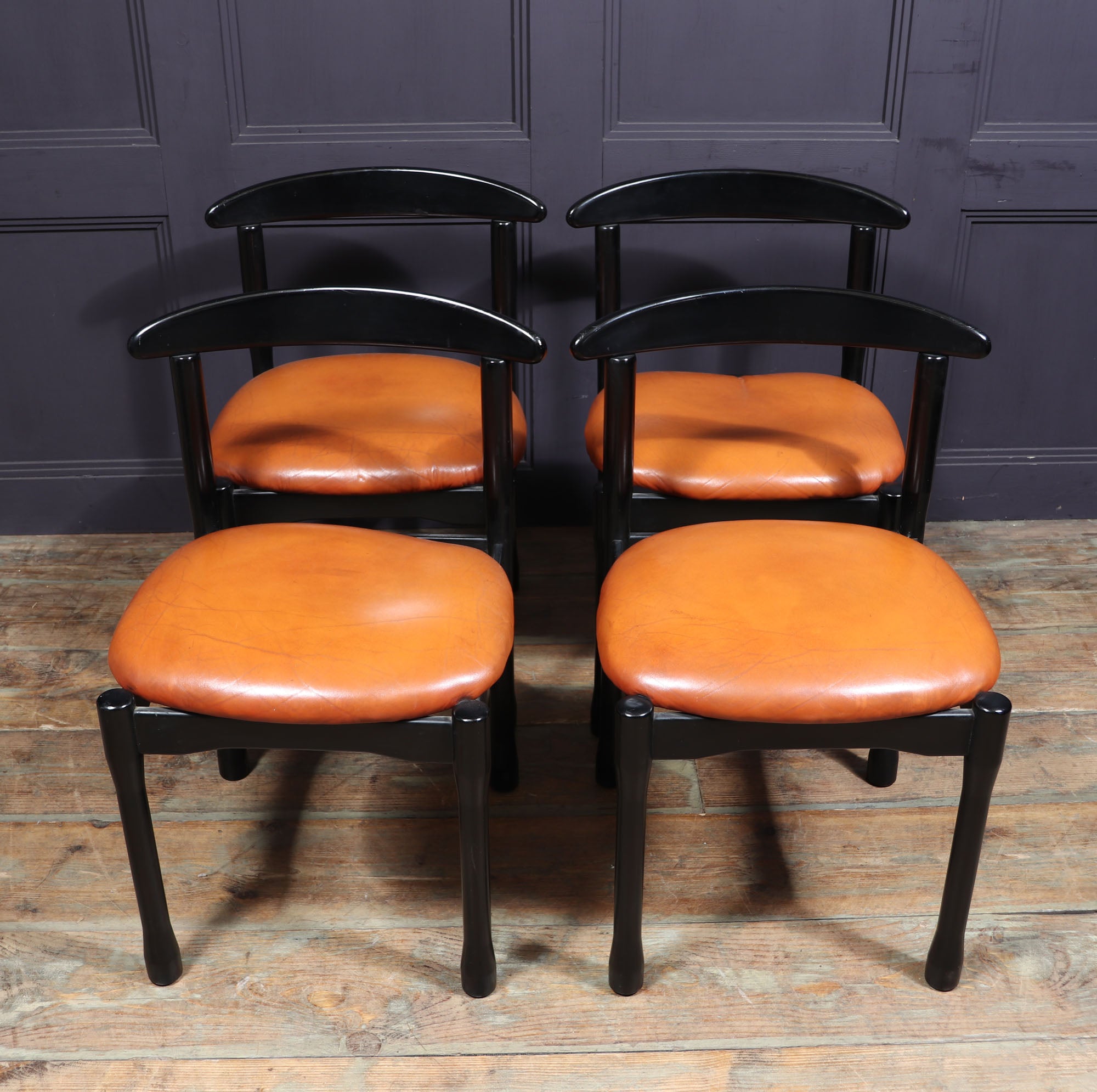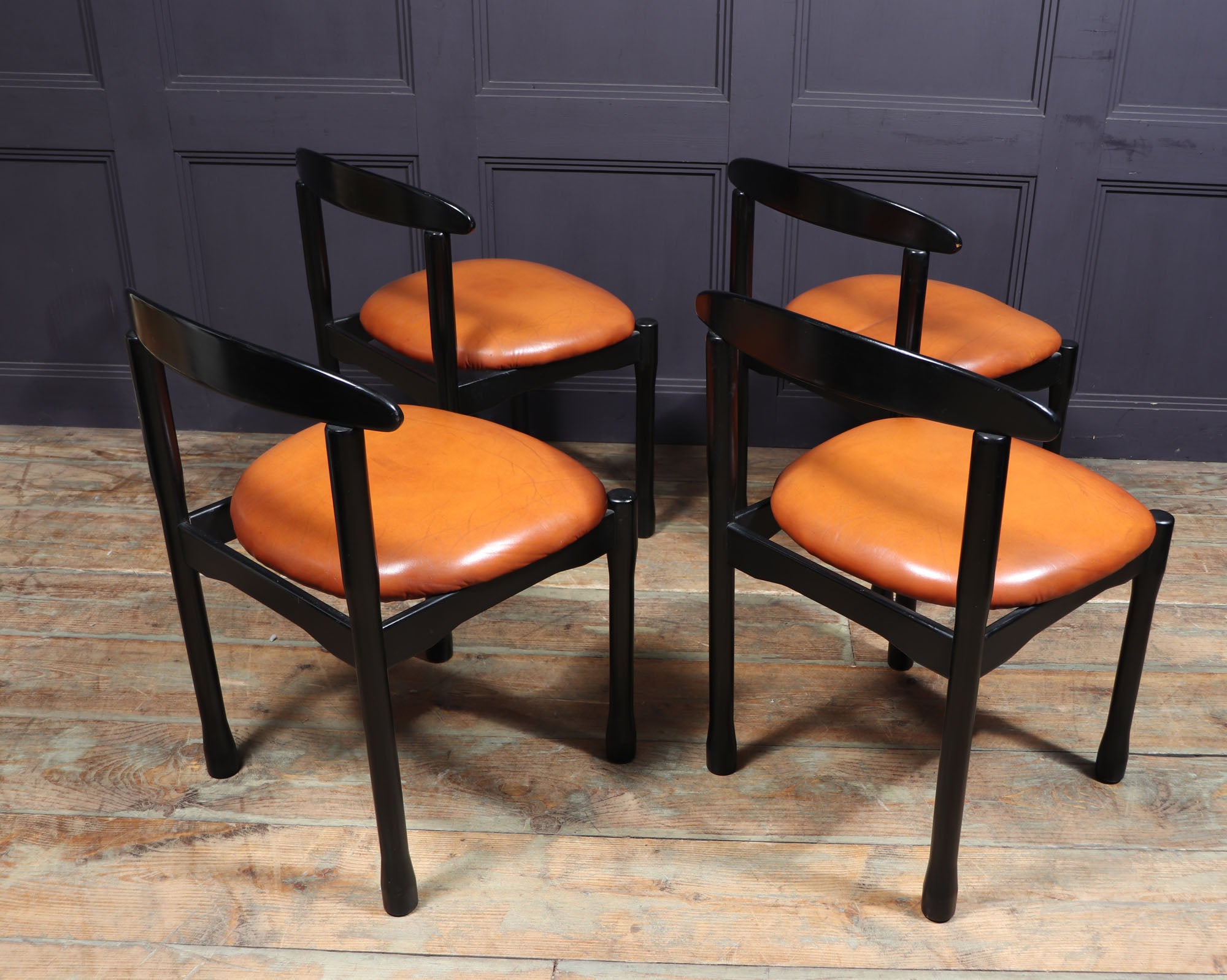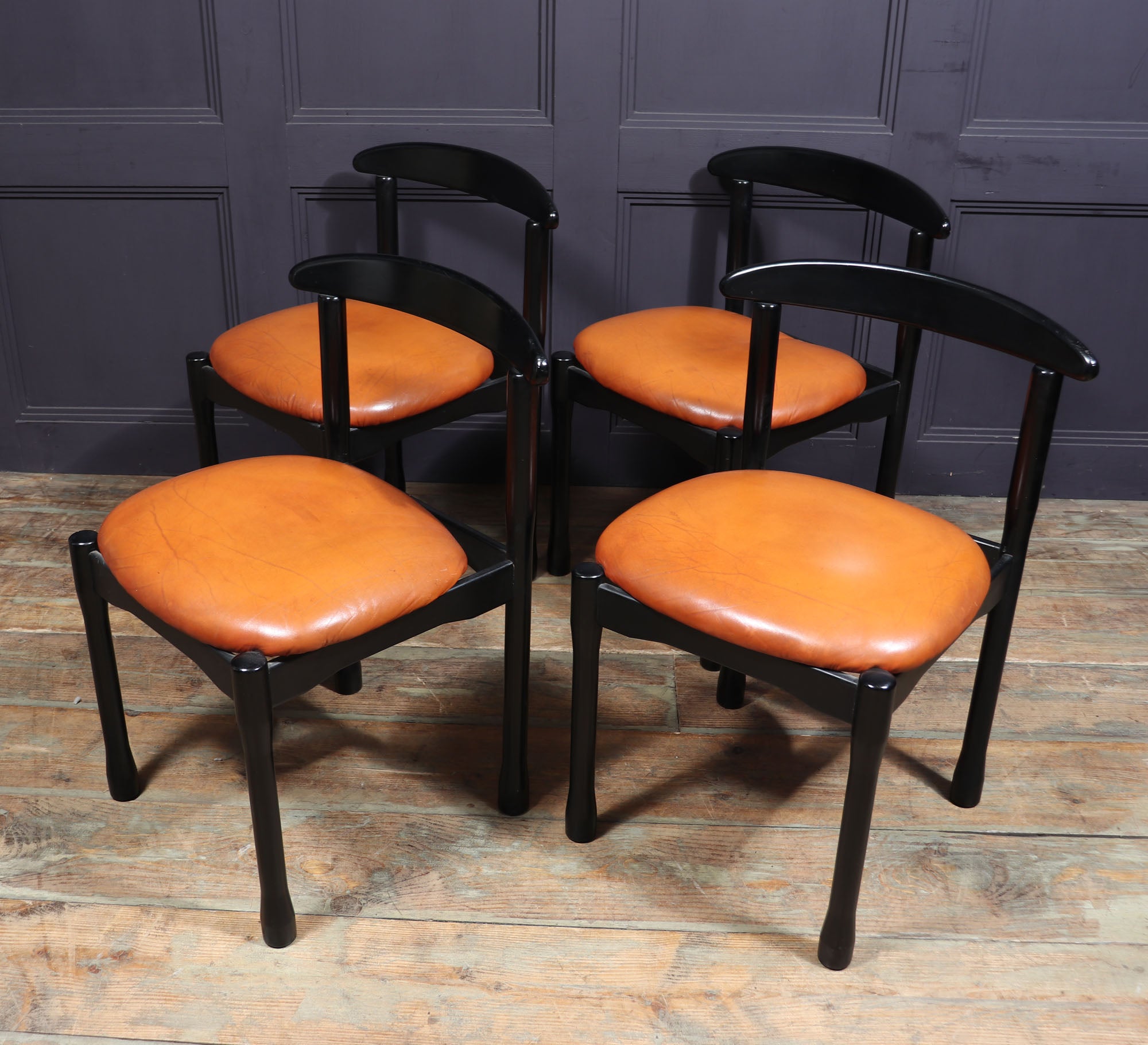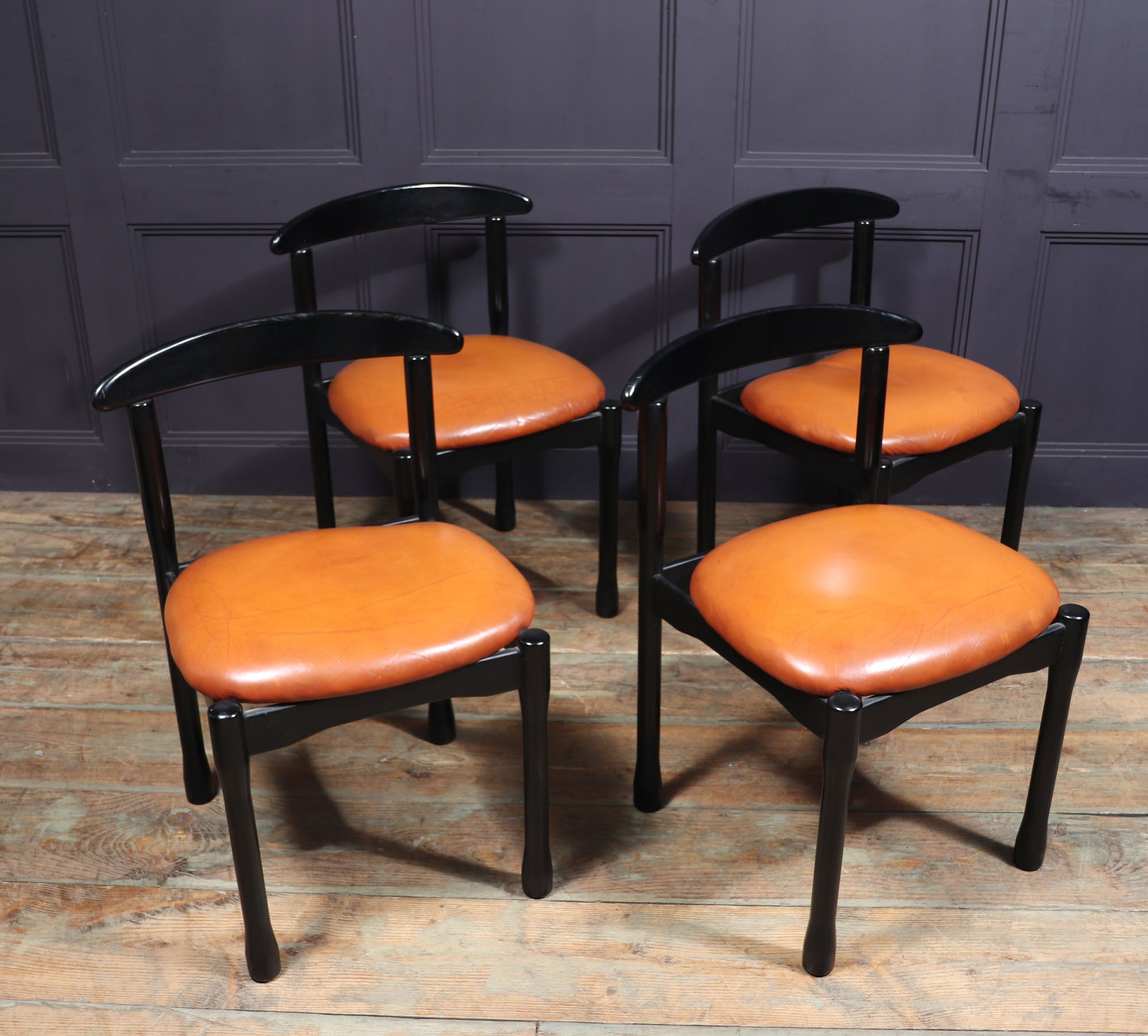 This set of four mid century Italian dining chairs are an iconic piece of mid-century design by renowned architect and designer Vico Magistretti. Crafted from ebonised wood, these striking chairs feature a curved backrest that adds sophistication to any dining space.