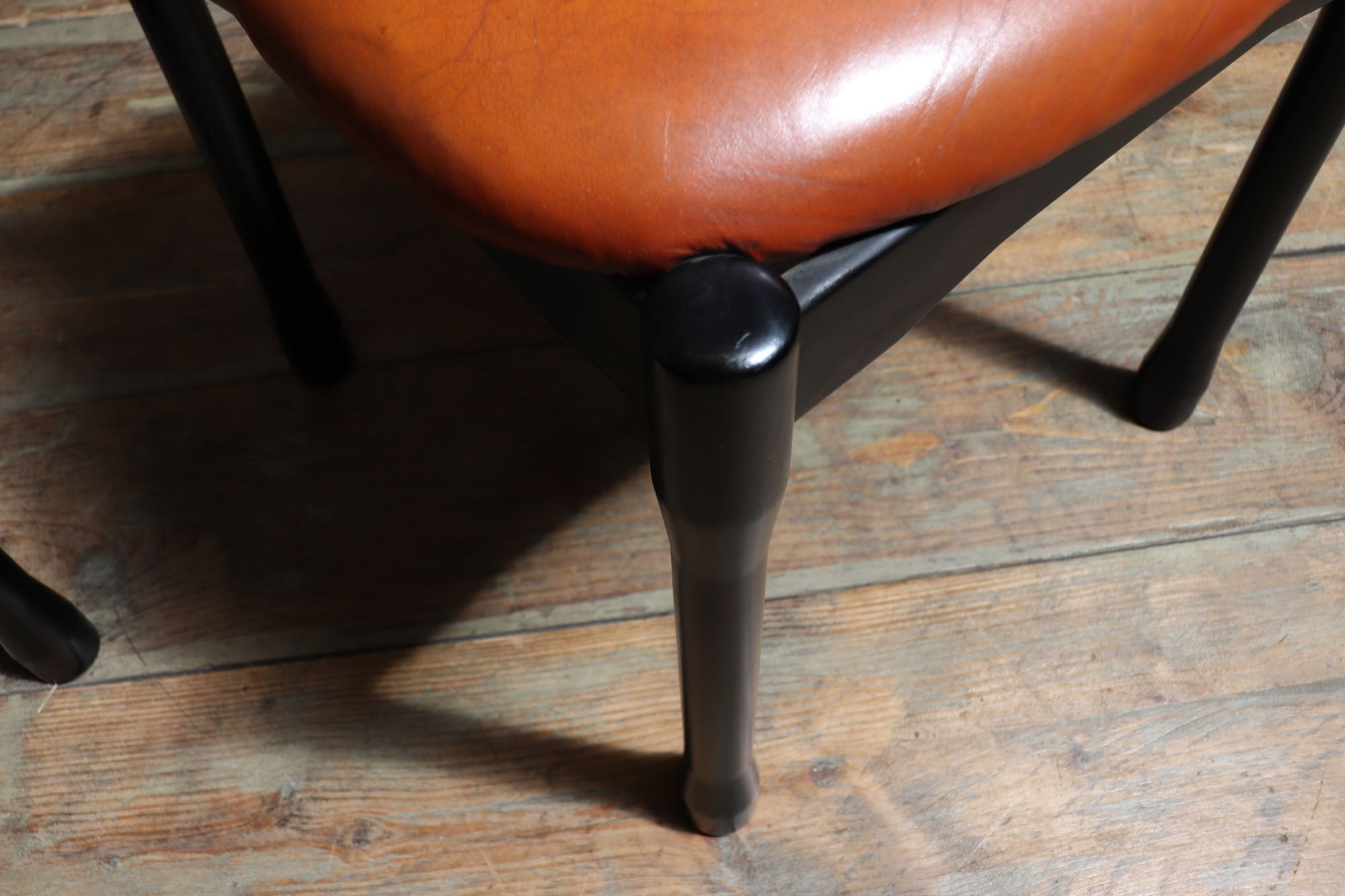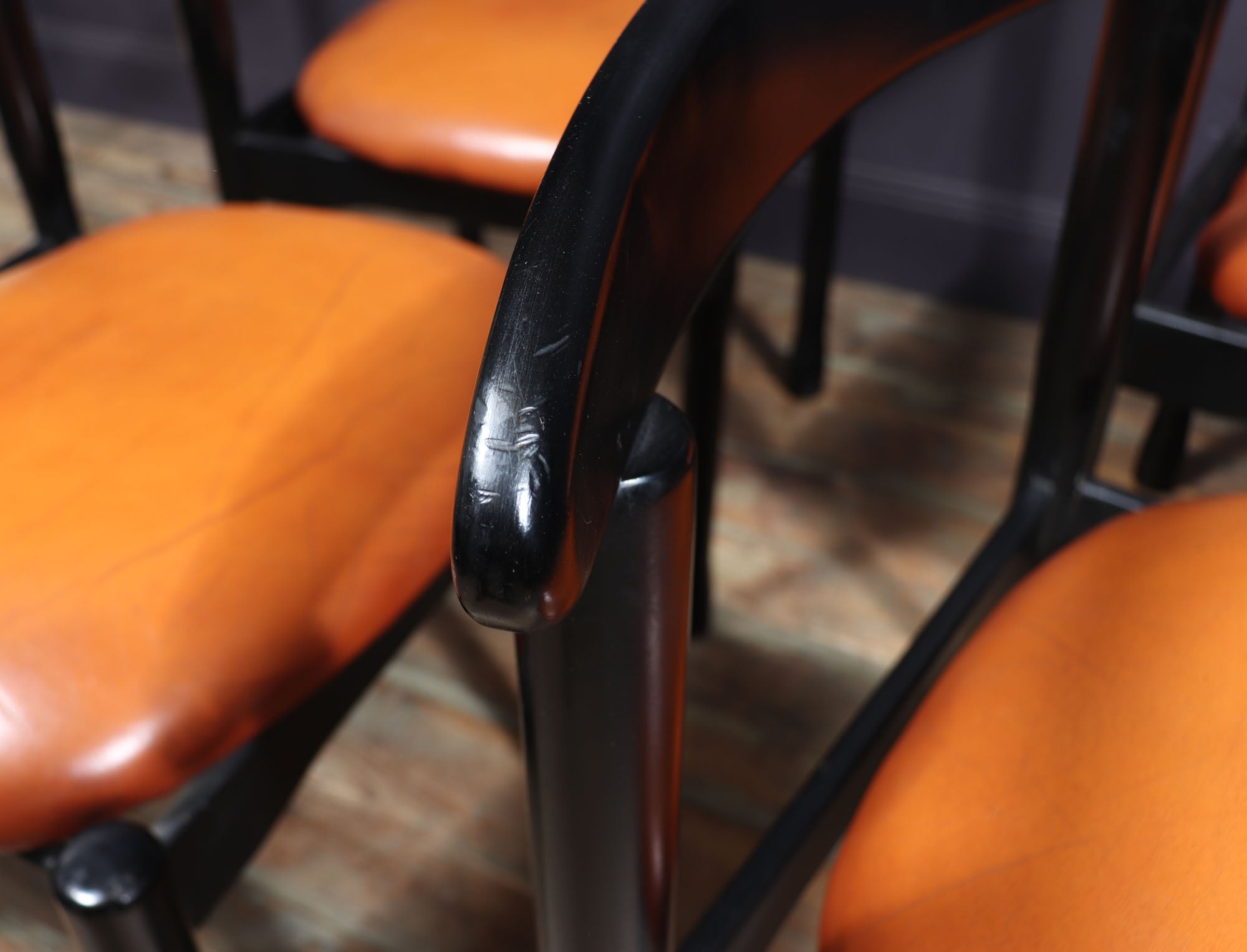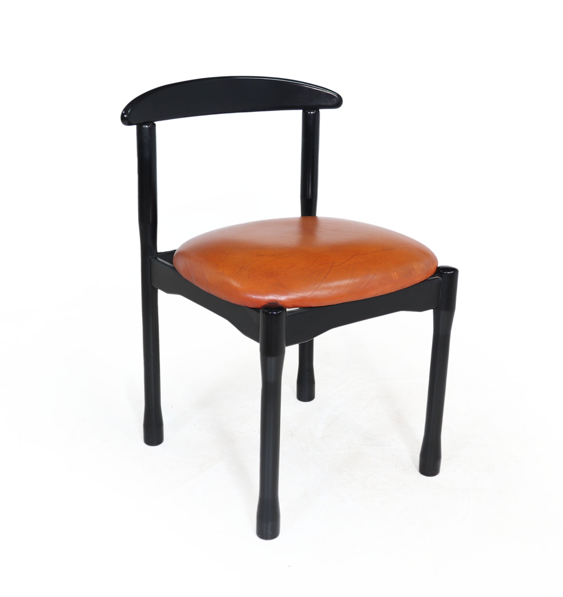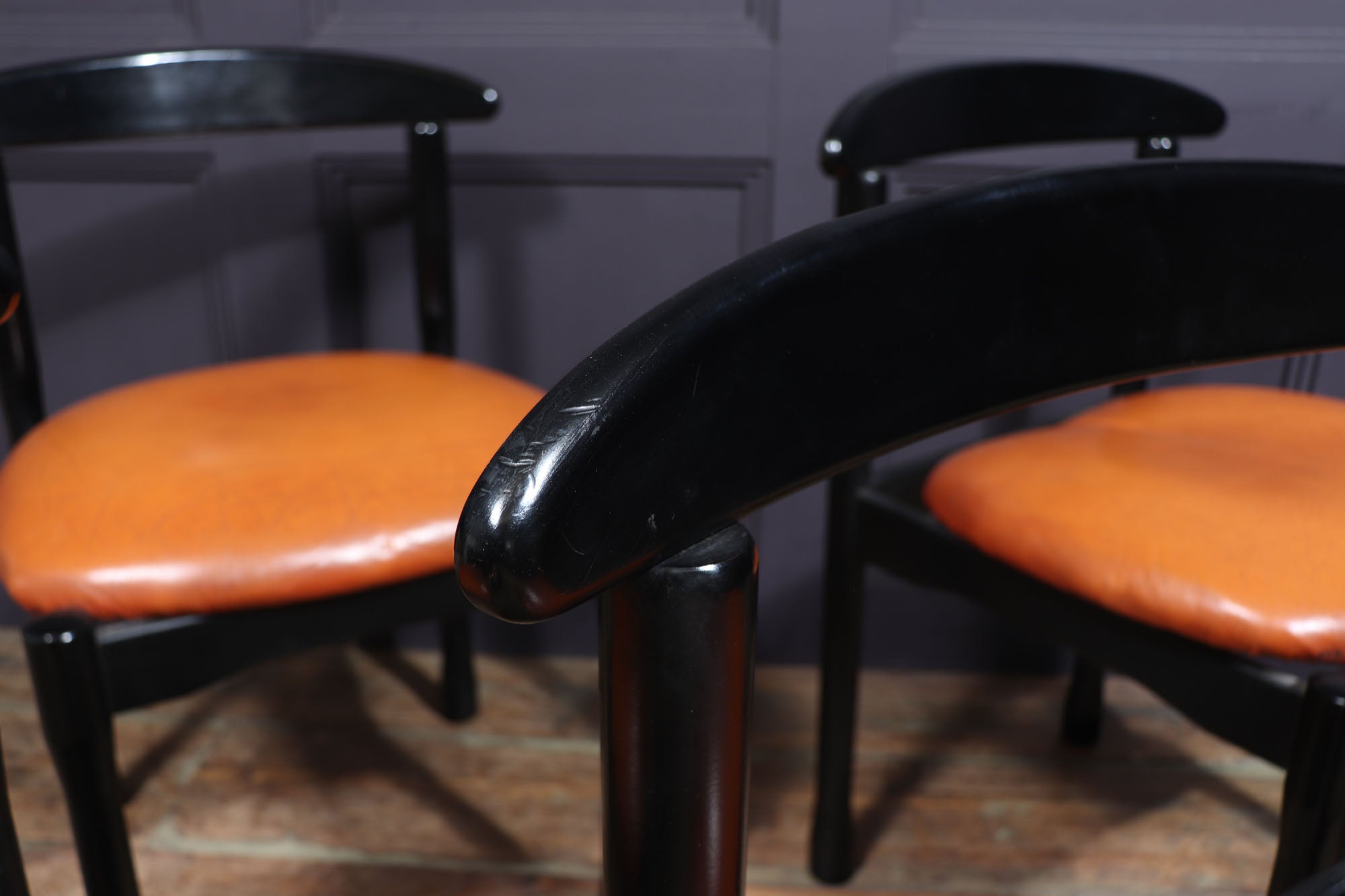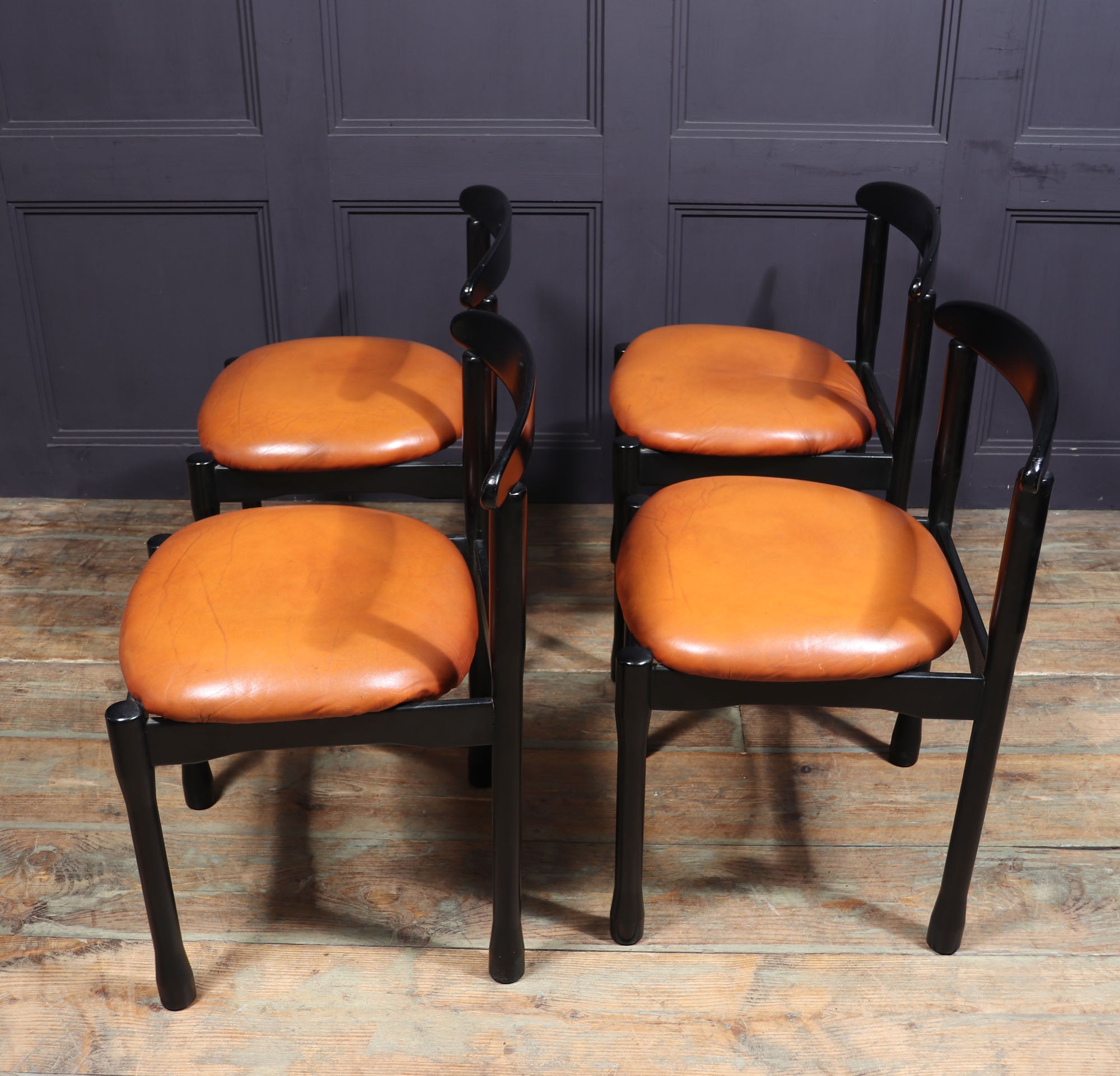 This set of four mid century Italian dining chairs are an iconic piece of mid-century design by renowned architect and designer Vico Magistretti. Crafted from ebonised wood, these striking chairs feature a curved backrest that adds sophistication to any dining space.