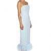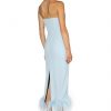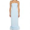 THE MINELLI IS A BUSTIER-STYLE DRESS INTENDED TO FALL MID-LENGTH. IT HAS AN INTERIOR CORSET WITH BONING AT THE CHEST AND IS COMPLETE WITH FRONT AND BACK DARTS. ITS SLEEK OSTRICH-FEATHER TRIM SKIRT HAS A BACK VENT AND THE DRESS IS FASTENED WITH A CONCEALED ZIP AT THE BACK.Â