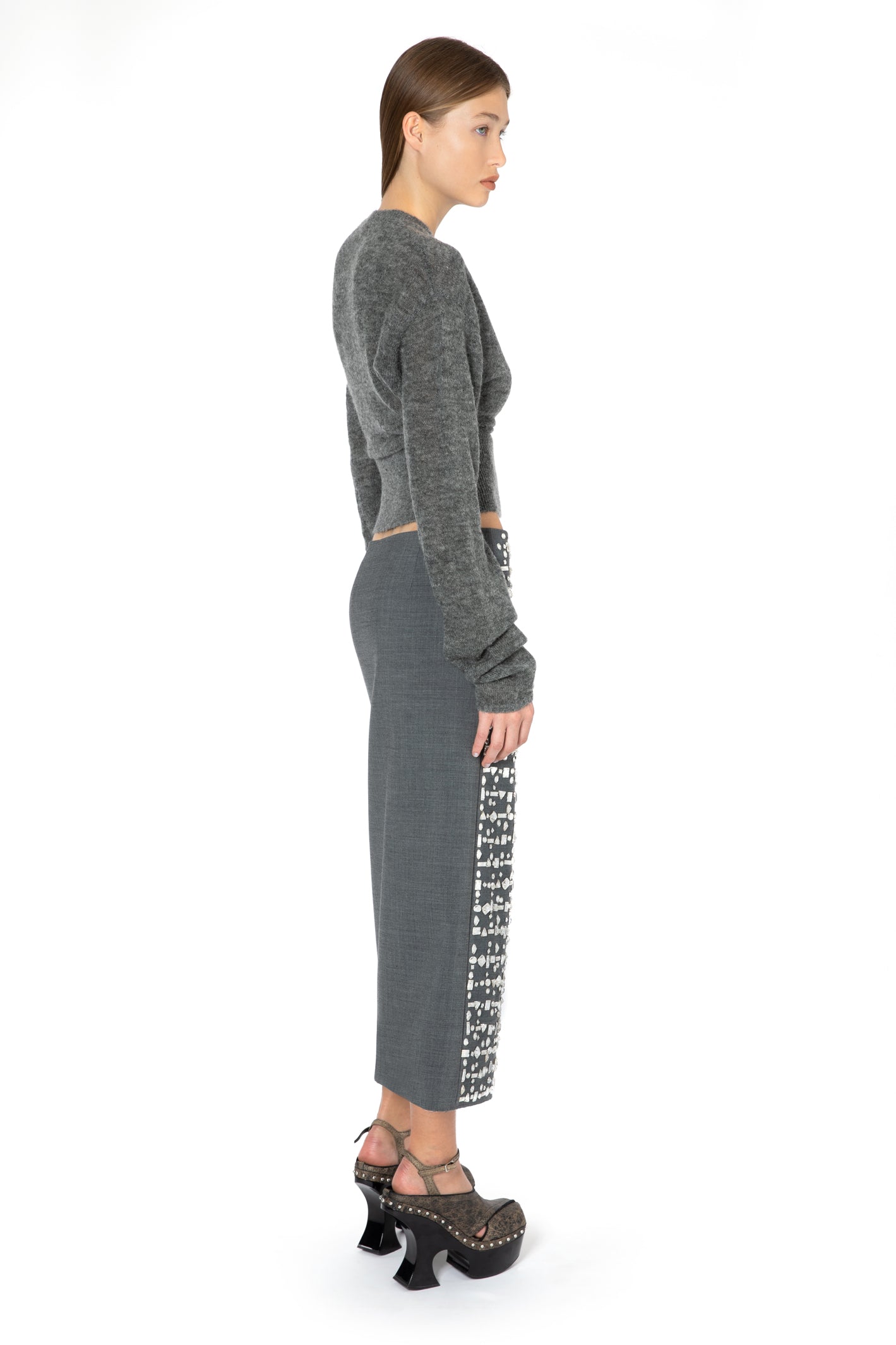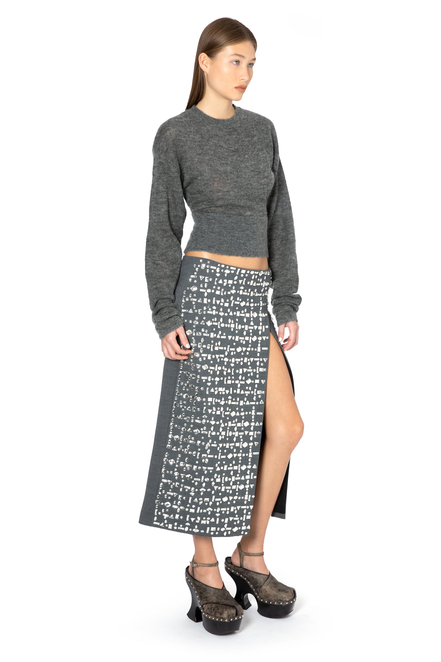 THEÂ MINERVA MIDI SKIRT IN ANTHRACITE CRYSTAL CHECKÂ FEATURES STATEMENT HAND PLACED CRYSTAL EMBROIDERY IN A CHECK PATTERN. IT IS CUT IN A SLIM FIT WITH AN SPLIT AT THE FRONT AND CLOSES WITH A ZIP AND HOOK AND EYE.