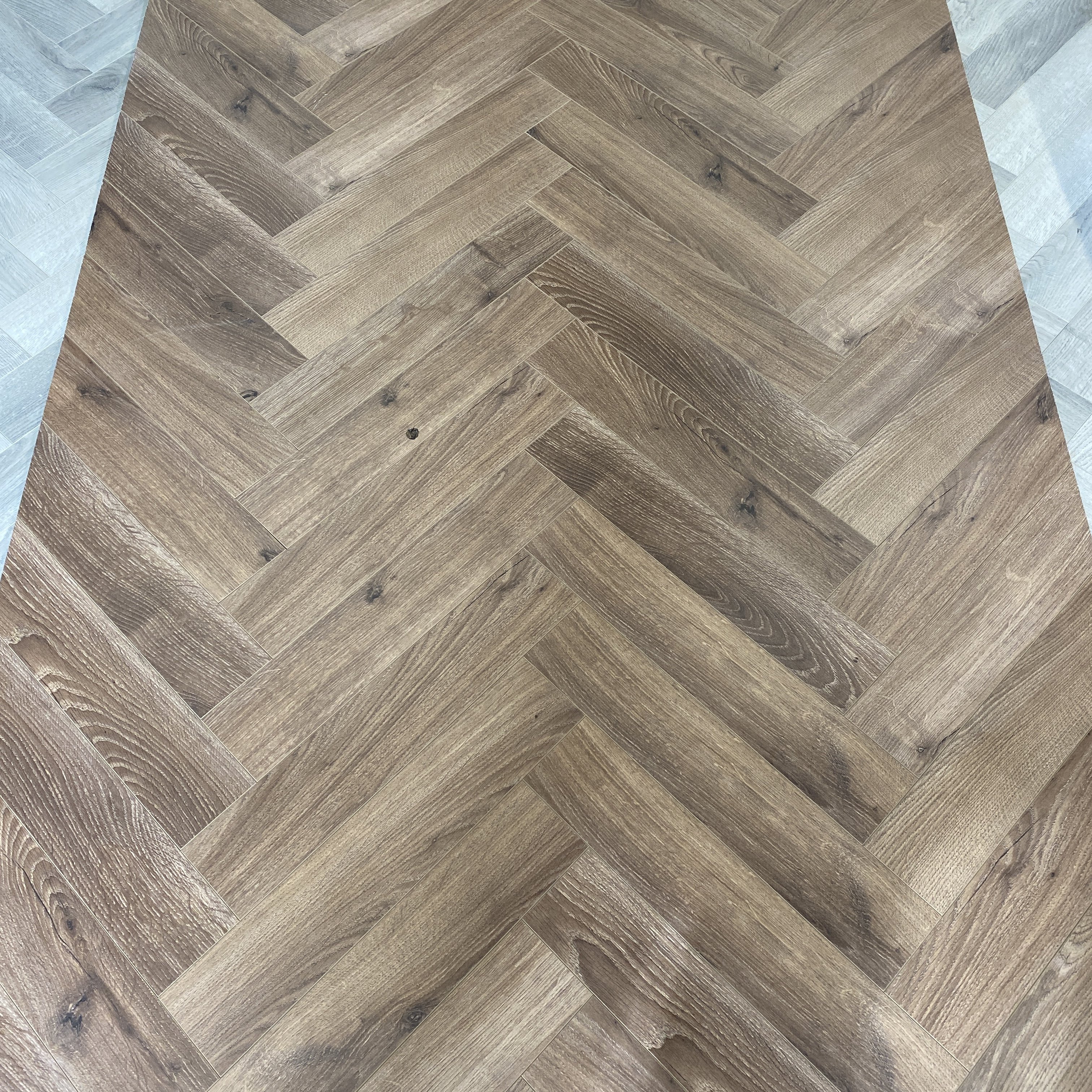 Specification: Mocha Oak Herringbone Laminate – 12mm – Water & Scratch Resistant – Wood Floor Store