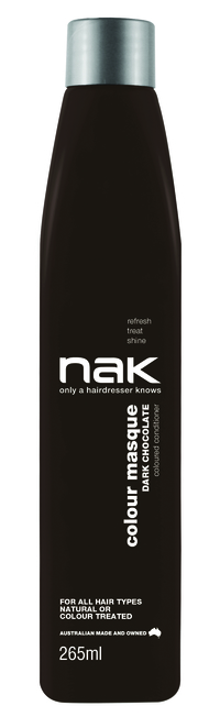 Join the Brunette Bronze obsession and gloss in Dark Chocolate.nak Colour Masque Coloured Conditioner in Dark Chocolate deposits opalescent colour and shine to refresh both colour treated hair and natural hair. Also available in a wide range of other colours.Benefits:1. Cationic conditioning pigments – gloss enhancing Macadamia Oil2. Strengthening Sea Proteins, luxurious treatment Botanicals3. Boosts colour intensity, promoting vibrancy and shine4. Prevents colour fade and maintains colour between services5. Versatile colour collection from high fashion to natural6. Conditioning colour longevity from roots to ends7. Masks greys, blends style and shade variations8. Introduces clients to new and different colour concepts9. In salon basin express service, for on the go refresh and shine10. Simple, easy after cleansing retail application11. Sulphate free. Paraben free.Recommended For:Dark Chocolate – warm chocolate tones, designed for all hair types.How to use:(Wear gloves as staining of hands, towels, tiles and grout may occur)Option 1Step 1: Cleanse with NAK ShampooStep 2: Apply evenly to clean damp hair from roots to endsStep 3: Massage into hair and comb through to distribute evenlyStep 4: Leave-in for 3-5 mins, rinse well until water runs clearStep 5: Towel-dry, apply NAK colour Fix Leave-in TreatmentOption 2 – For increased VibrancyStep 1: Cleanse with recommended NAK shampooStep 2: Apply evenly to towel-dried hair from roots to endsStep 3: Massage into hair and comb through to distribute evenlyStep 4: Leave-in for 5-20 mins, rinse well until water runs clearStep 5: Towel-dry, apply NAK Colour Fix Leave-in TreatmentKey Ingredients:Formulated with strengthening Sea Proteins, luxurious treatment botanicals and enriched with gloss ehancing Macadamia Oils.