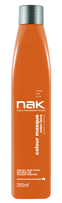 If nude and natural is your thing then swirl in Honey Beige.nak Colour Masque Coloured Conditioner in Honey Beige deposits opalescent colour and shine to refresh both colour treated hair and natural hair. Also available in a wide range of other colours.Benefits:1. Cationic conditioning pigments – gloss enhancing Macadamia Oil2. Strengthening Sea Proteins, luxurious treatment Botanicals3. Boosts colour intensity, promoting vibrancy and shine4. Prevents colour fade and maintains colour between services5. Versatile colour collection from high fashion to natural6. Conditioning colour longevity from roots to ends7. Masks greys, blends style and shade variations8. Introduces clients to new and different colour concepts9. In salon basin express service, for on the go refresh and shine10. Simple, easy after cleansing retail application11. Sulphate free. Paraben free.Recommended For:Honey Beige – warm honey tones, designed for all hair types.How to use:(Wear gloves as staining of hands, towels, tiles and grout may occur)Option 1Step 1: Cleanse with NAK ShampooStep 2: Apply evenly to clean damp hair from roots to endsStep 3: Massage into hair and comb through to distribute evenlyStep 4: Leave-in for 3-5 mins, rinse well until water runs clearStep 5: Towel-dry, apply NAK colour Fix Leave-in TreatmentOption 2 – For increased VibrancyStep 1: Cleanse with recommended NAK shampooStep 2: Apply evenly to towel-dried hair from roots to endsStep 3: Massage into hair and comb through to distribute evenlyStep 4: Leave-in for 5-20 mins, rinse well until water runs clearStep 5: Towel-dry, apply NAK Colour Fix Leave-in TreatmentKey Ingredients:Formulated with strengthening Sea Proteins, luxurious treatment botanicals and enriched with gloss ehancing Macadamia Oils.