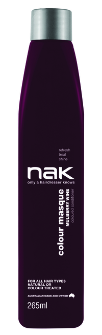 A Winters tale of Mulberry Wine, think Dark Purple Aubergine hues.nak Colour Masque Coloured Conditioner in Mulberry Wine deposits opalescent colour and shine to refresh both colour treated hair and natural hair. Also available in a wide range of other colours.Benefits:1. Cationic conditioning pigments – gloss enhancing Macadamia Oil2. Strengthening Sea Proteins, luxurious treatment Botanicals3. Boosts colour intensity, promoting vibrancy and shine4. Prevents colour fade and maintains colour between services5. Versatile colour collection from high fashion to natural6. Conditioning colour longevity from roots to ends7. Masks greys, blends style and shade variations8. Introduces clients to new and different colour concepts9. In salon basin express service, for on the go refresh and shine10. Simple, easy after cleansing retail application11. Sulphate free. Paraben free.Recommended For:Mulberry Wine – deep violet tones, designed for all hair types.How to use:(Wear gloves as staining of hands, towels, tiles and grout may occur)Option 1Step 1: Cleanse with NAK ShampooStep 2: Apply evenly to clean damp hair from roots to endsStep 3: Massage into hair and comb through to distribute evenlyStep 4: Leave-in for 3-5 mins, rinse well until water runs clearStep 5: Towel-dry, apply NAK colour Fix Leave-in TreatmentOption 2 – For increased VibrancyStep 1: Cleanse with recommended NAK shampooStep 2: Apply evenly to towel-dried hair from roots to endsStep 3: Massage into hair and comb through to distribute evenlyStep 4: Leave-in for 5-20 mins, rinse well until water runs clearStep 5: Towel-dry, apply NAK Colour Fix Leave-in TreatmentKey Ingredients:Formulated with strengthening Sea Proteins, luxurious treatment botanicals and enriched with gloss ehancing Macadamia Oils.