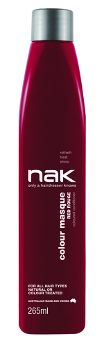 Unlace your inner burlesque with a show stopping Red Rouge.nak Colour Masque Coloured Conditioner in Red Rouge deposits opalescent colour and shine to refresh both colour treated hair and natural hair. Also available in a wide range of other colours.Benefits:1. Cationic conditioning pigments – gloss enhancing Macadamia Oil2. Strengthening Sea Proteins, luxurious treatment Botanicals3. Boosts colour intensity, promoting vibrancy and shine4. Prevents colour fade and maintains colour between services5. Versatile colour collection from high fashion to natural6. Conditioning colour longevity from roots to ends7. Masks greys, blends style and shade variations8. Introduces clients to new and different colour concepts9. In salon basin express service, for on the go refresh and shine10. Simple, easy after cleansing retail application11. Sulphate free. Paraben free.Recommended For:Red Rouge – red tones, designed for all hair types.How to use:(Wear gloves as staining of hands, towels, tiles and grout may occur)Option 1Step 1: Cleanse with NAK ShampooStep 2: Apply evenly to clean damp hair from roots to endsStep 3: Massage into hair and comb through to distribute evenlyStep 4: Leave-in for 3-5 mins, rinse well until water runs clearStep 5: Towel-dry, apply NAK colour Fix Leave-in TreatmentOption 2 – For increased VibrancyStep 1: Cleanse with recommended NAK shampooStep 2: Apply evenly to towel-dried hair from roots to endsStep 3: Massage into hair and comb through to distribute evenlyStep 4: Leave-in for 5-20 mins, rinse well until water runs clearStep 5: Towel-dry, apply NAK Colour Fix Leave-in TreatmentKey Ingredients:Formulated with strengthening Sea Proteins, luxurious treatment botanicals and enriched with gloss ehancing Macadamia Oils.