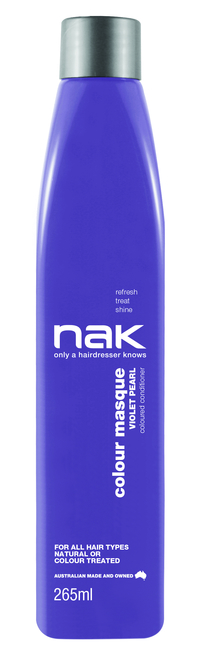 Gold be gone with Violet Pearl. Banish the brass and transform yellow tones into a more desirable creamy lilac blonde.nak Colour Masque Coloured Conditioner in Violet Pearl deposits opalescent colour and shine to refresh both colour treated hair and natural hair. Also available in a wide range of other colours.Benefits:1. Cationic conditioning pigments – gloss enhancing Macadamia Oil2. Strengthening Sea Proteins, luxurious treatment Botanicals3. Boosts colour intensity, promoting vibrancy and shine4. Prevents colour fade and maintains colour between services5. Versatile colour collection from high fashion to natural6. Conditioning colour longevity from roots to ends7. Masks greys, blends style and shade variations8. Introduces clients to new and different colour concepts9. In salon basin express service, for on the go refresh and shine10. Simple, easy after cleansing retail application11. Sulphate free. Paraben free.Recommended For:Violet Pearl – cool violet tones, designed for all hair types.How to use:(Wear gloves as staining of hands, towels, tiles and grout may occur)Option 1Step 1: Cleanse with NAK ShampooStep 2: Apply evenly to clean damp hair from roots to endsStep 3: Massage into hair and comb through to distribute evenlyStep 4: Leave-in for 3-5 mins, rinse well until water runs clearStep 5: Towel-dry, apply NAK colour Fix Leave-in TreatmentOption 2 – For increased VibrancyStep 1: Cleanse with recommended NAK shampooStep 2: Apply evenly to towel-dried hair from roots to endsStep 3: Massage into hair and comb through to distribute evenlyStep 4: Leave-in for 5-20 mins, rinse well until water runs clearStep 5: Towel-dry, apply NAK Colour Fix Leave-in TreatmentKey Ingredients:Formulated with strengthening Sea Proteins, luxurious treatment botanicals and enriched with gloss ehancing Macadamia Oils.
