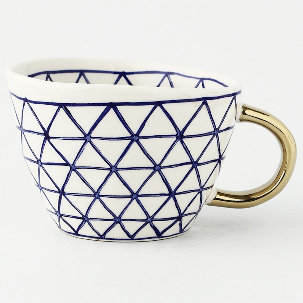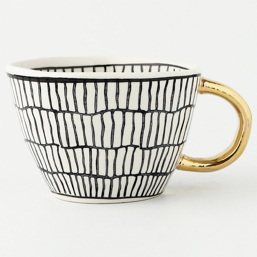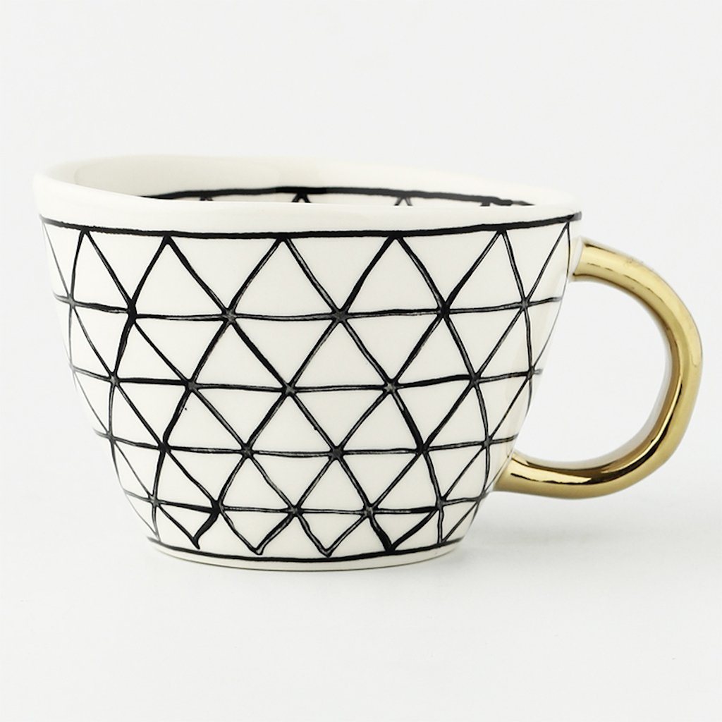 Drink in style with our Nordic Mugs. Each mug is crafted by hand to produce wonderfully unique shapes and curves. Combined with intricate patterns and embellished with gorgeous gold handles, they will stand out in your kitchen and wow your guests. Perfect for a morning coffee, after dinner tea, or hot chocolate in front of the TV. Mugs sold individually. Nordic Mugs – Lines & Dots – Drinkware – White / Black – Ceramic – Polka Dot Pattern – The Trouvailles