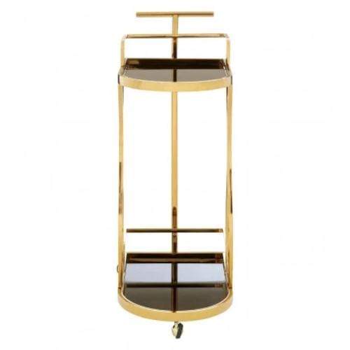 The Nova trolley is made from durable stainless steel, with slender design lines creating the elegant frame. Influenced by art deco style, each side of the trolly boasts wavy lines motif, counterpointing the straight lines of the trolley’s T-shaped handle. Each of the two tiers are created from tempered glass, with a sleek black finish.Specifications:Colour GoldProduct Dimensions W75 x D41 x H95cmMaterials Steel, Tempered GlassSafety & Delivery:Complies with the UK Fire Safety regulationsDelivery Dates: 10 to 14 Days