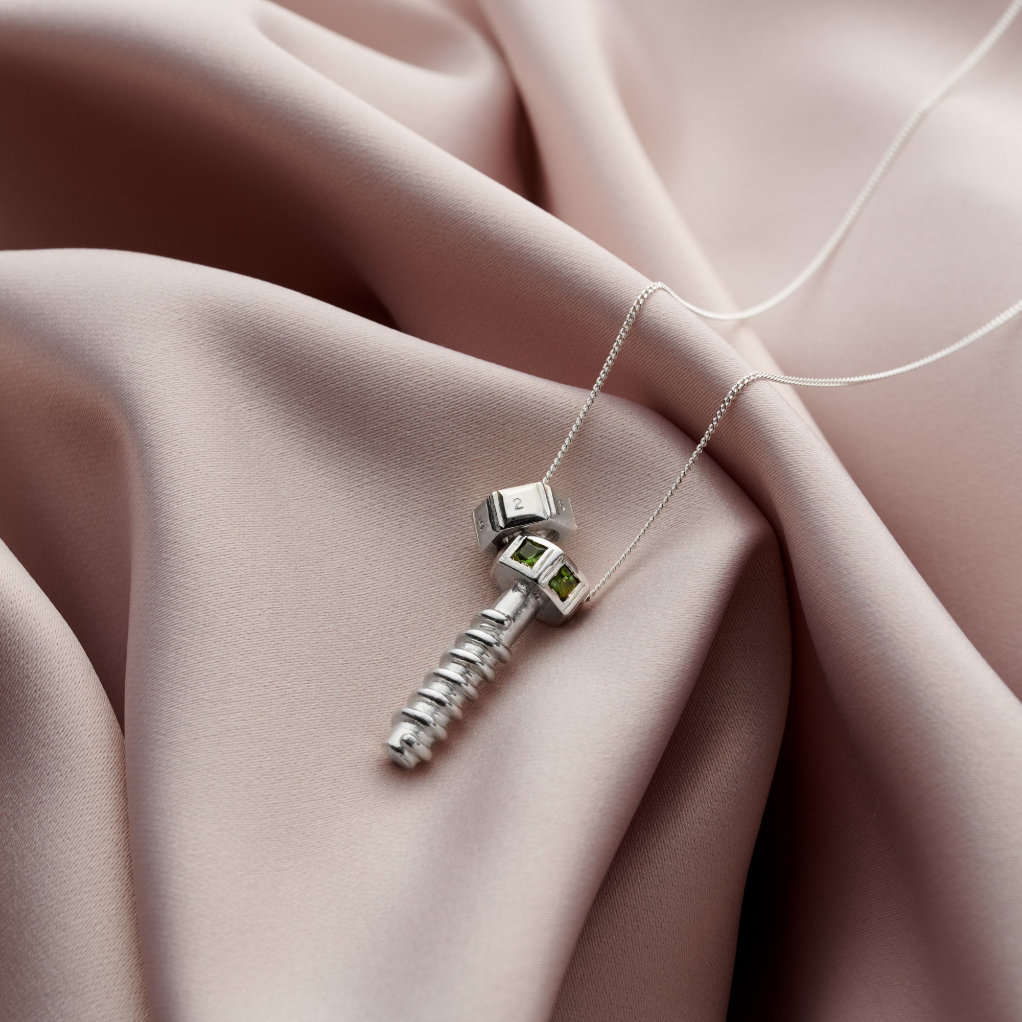 Contemporary sterling silver nut and bolt necklace, a cool and bold way to wear personalised jewellery with a twist. A unique his and hers necklace. – Nut & Bolt Gemstone Personalised Pendant