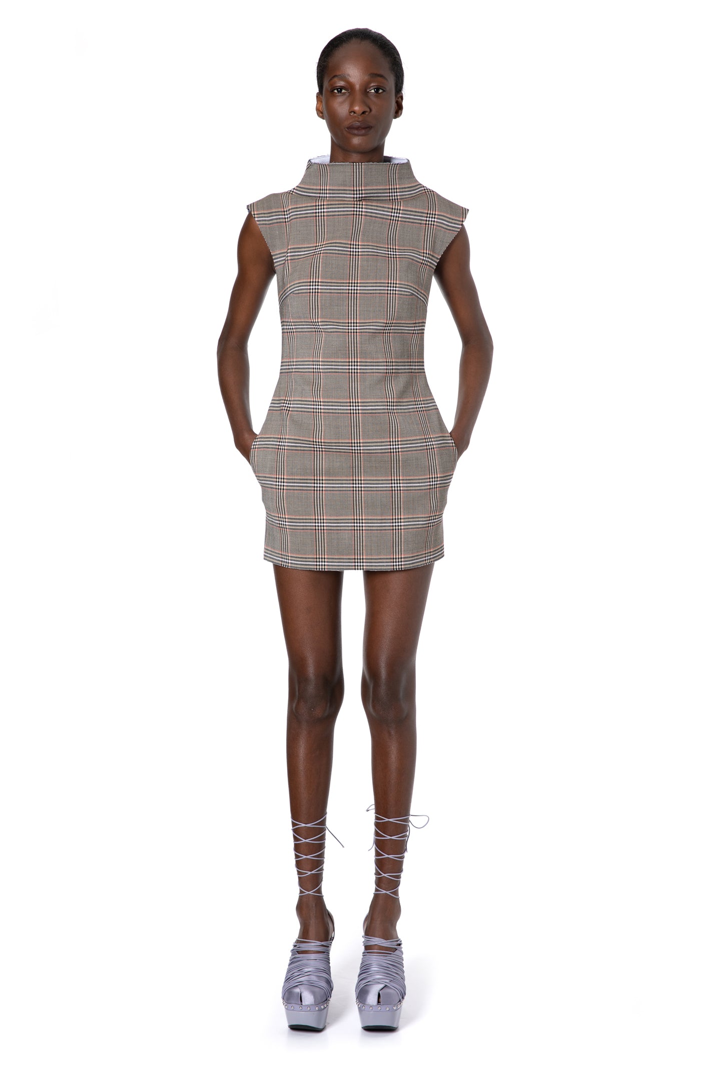 THE NYX MINI DRESS IN SAND LAVENDER PRINCE OF WALES CHECK. CUT IN A MINI LENGTH WITH A WIDE FUNNEL NECK. IT CLOSES WITH A ZIP.