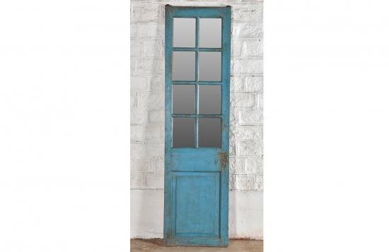 In a traditional Indian blue finish, this original door panel has had its glass panels replaced with mirrors to create a unique display mirror. A tall full sized mirror with a real twist, a real feature piece!