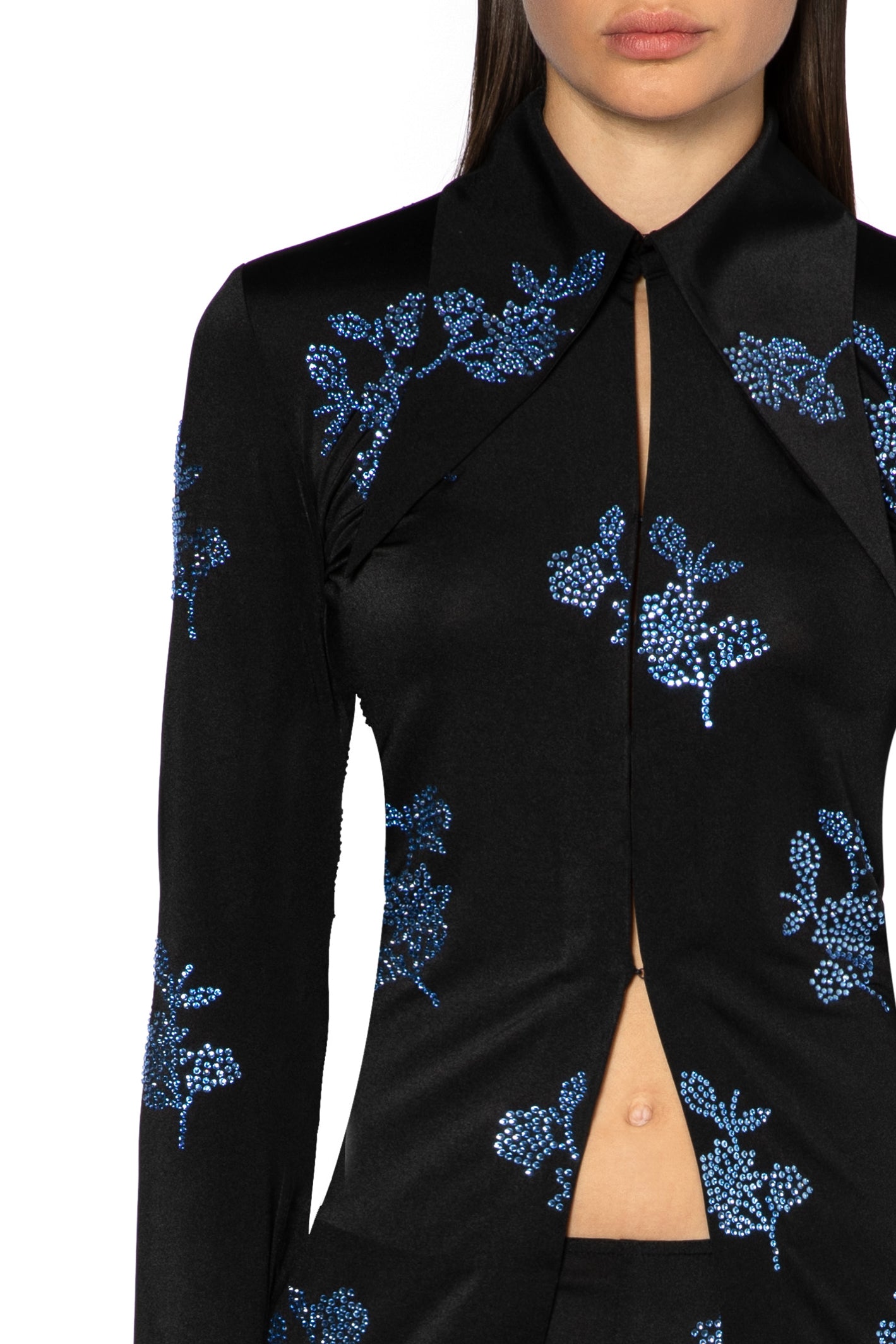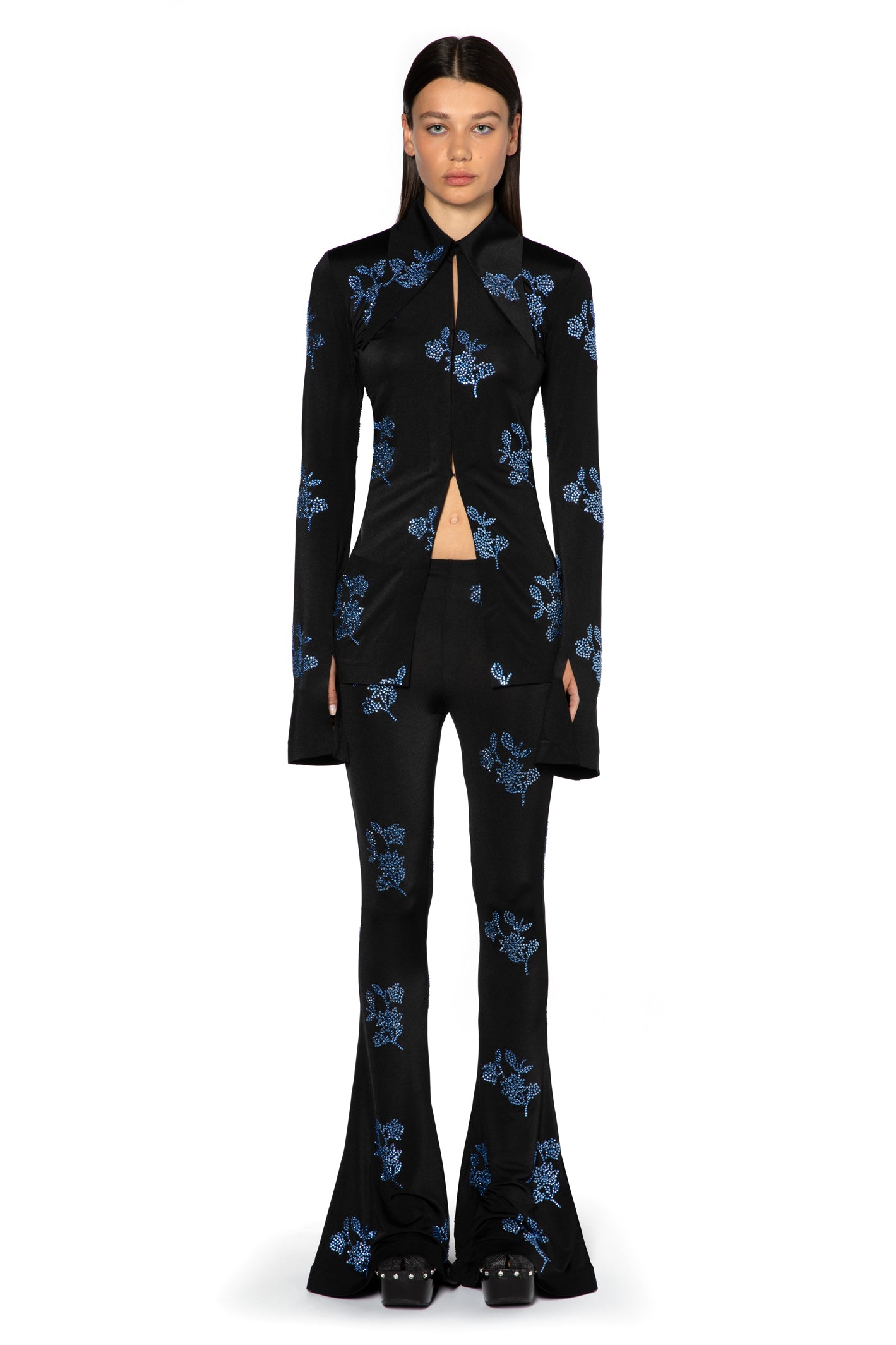 THE OPALA EMBELLISHED SHIRT IN BLACK AND BLUE FEATURES A SIGNATURE 16ARLINGTON OVERSIZED COLLAR WITH FLUTED SLEEVES AND SPLIT CUFFS AND EMBELLISHED WITH ALL OVER HOTFIX FLORAL MOTIFS IN A BLUE CRYSTAL. CUT IN A SLIM FIT WITH A SLIGHT STRETCH, IT HAS AÂ HOOK AND EYE CLOSURE AT THE FRONT. PAIR WITH THE MATCHING KORO TROUSERS.
