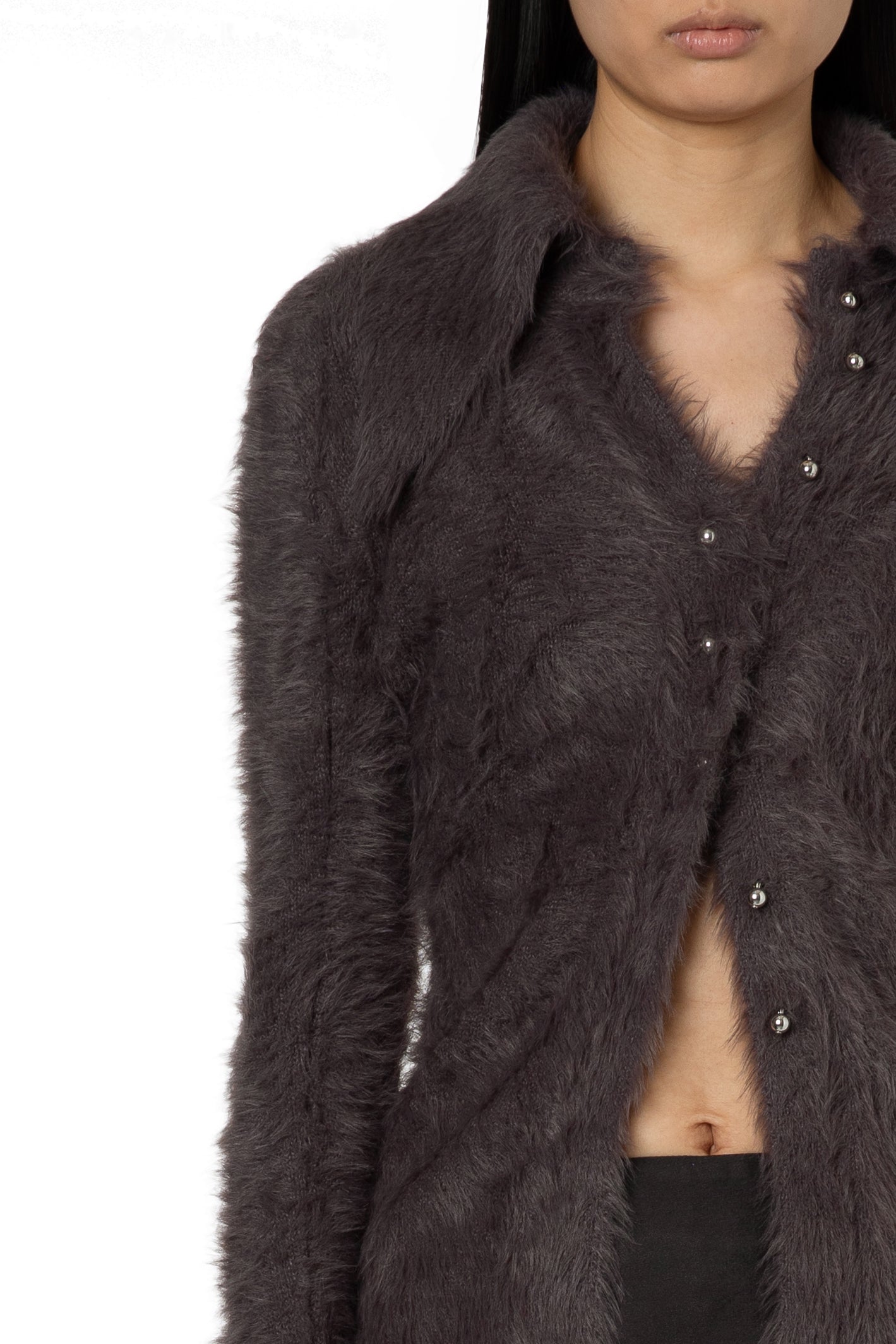 THE OPALAÂ KNITTEDÂ TOP INÂ CHARCOAL FEATURES A SIGNATURE 16ARLINGTON OVERSIZED COLLAR WITH FLUTED SLEEVES AND SPLIT CUFFS. CUT IN A SLIM FIT WITH A SLIGHT STRETCH, IT HAS A SILVER BALL BUTTON CLOSURE AT THE FRONT.Â