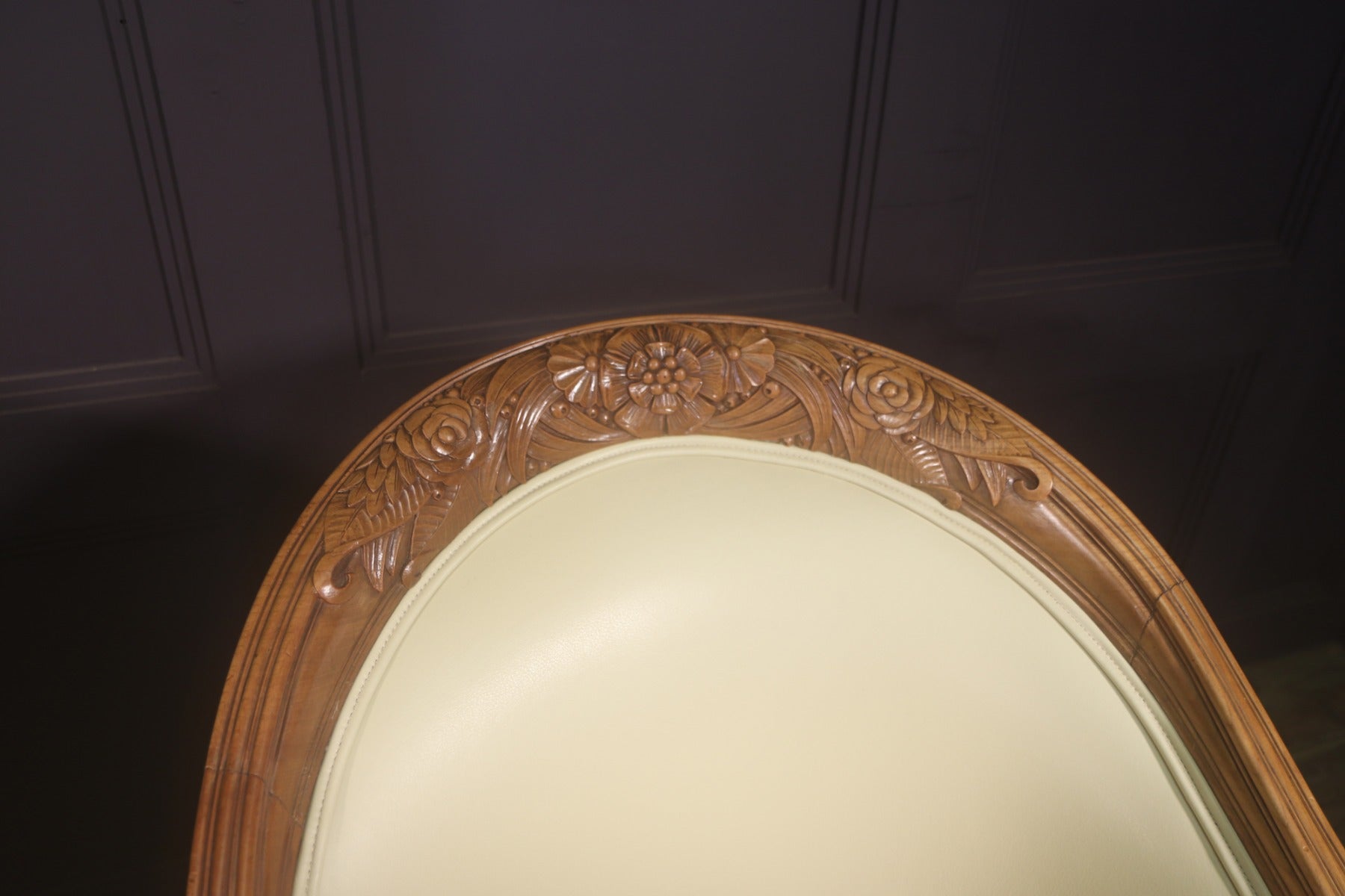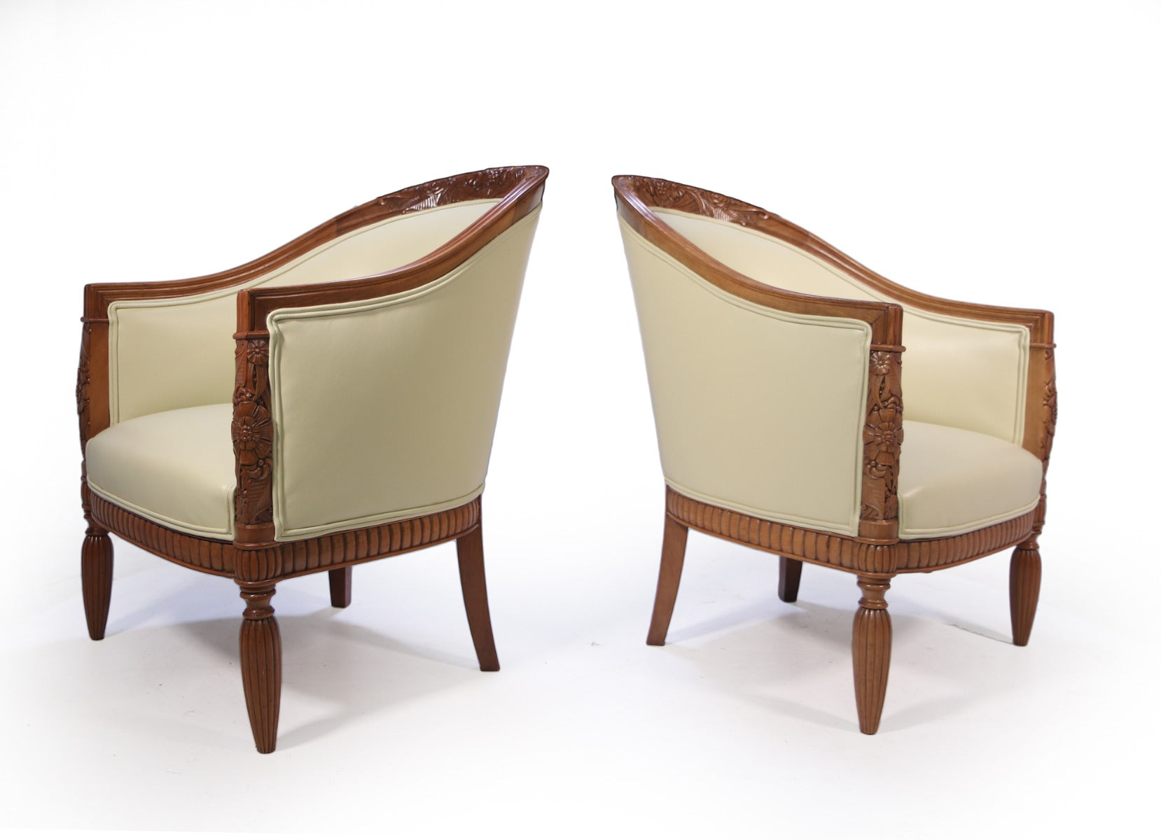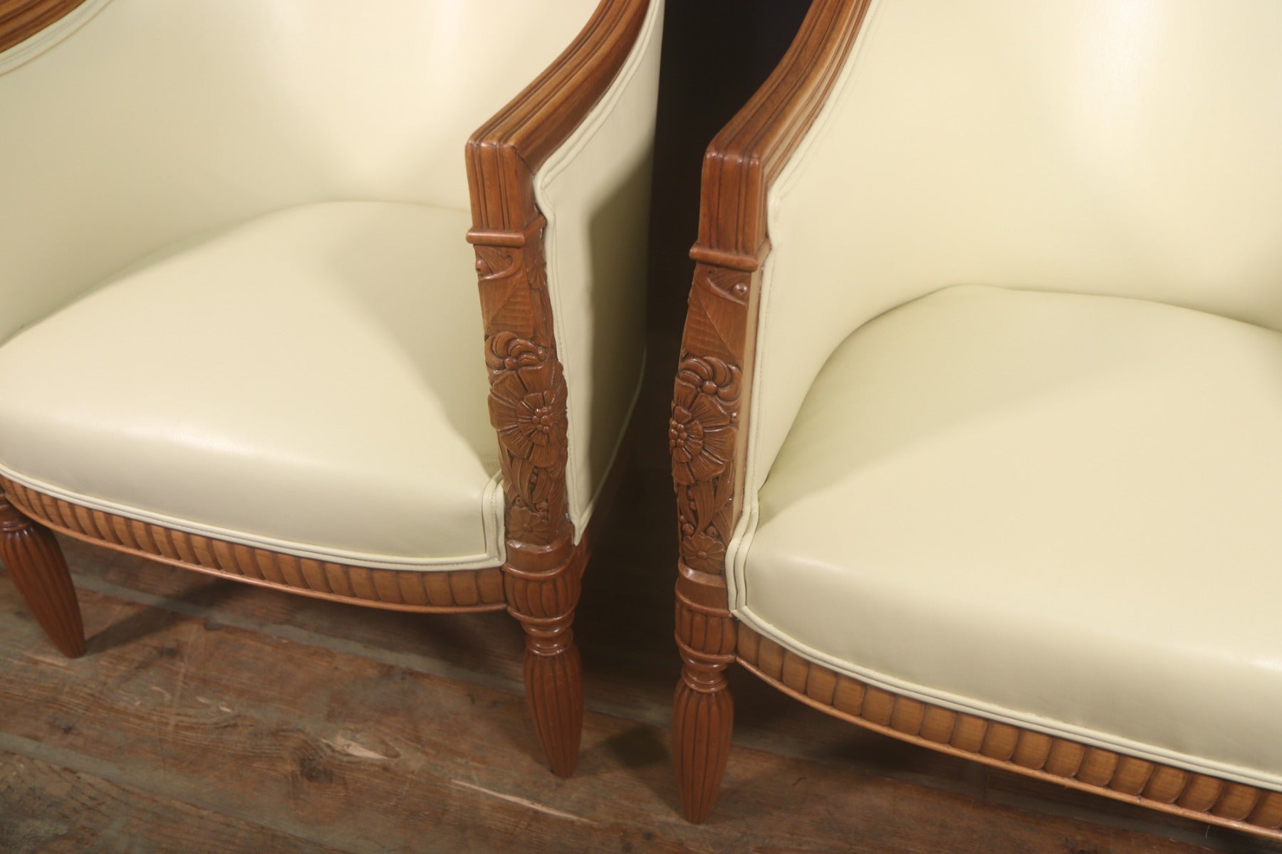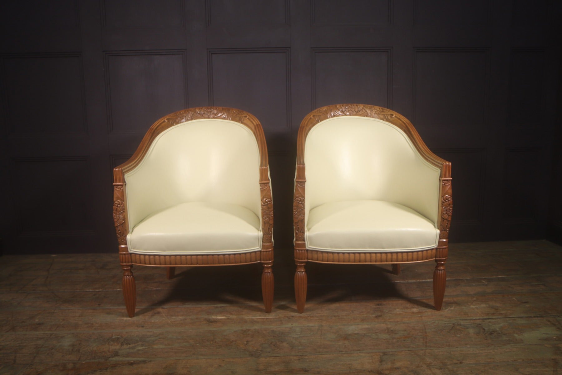 Pair of Carved Pear-wood French Art Deco Armchairs An exceptional pair of finely caved and sculpted armchairs, produced in France in the 1920���s the frames are solid pear, the chairs have been fully upholstered and covered in cream colour soft leath