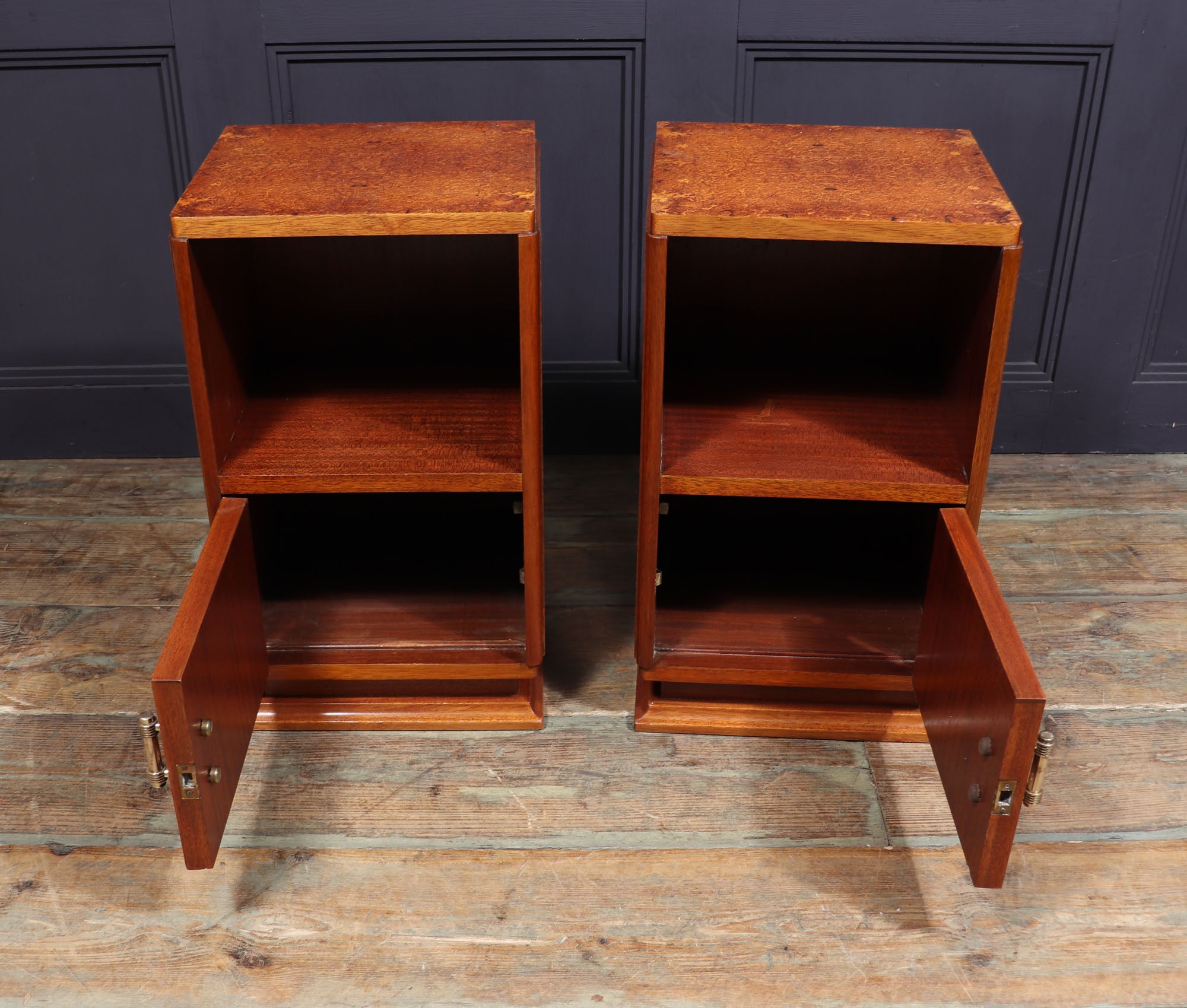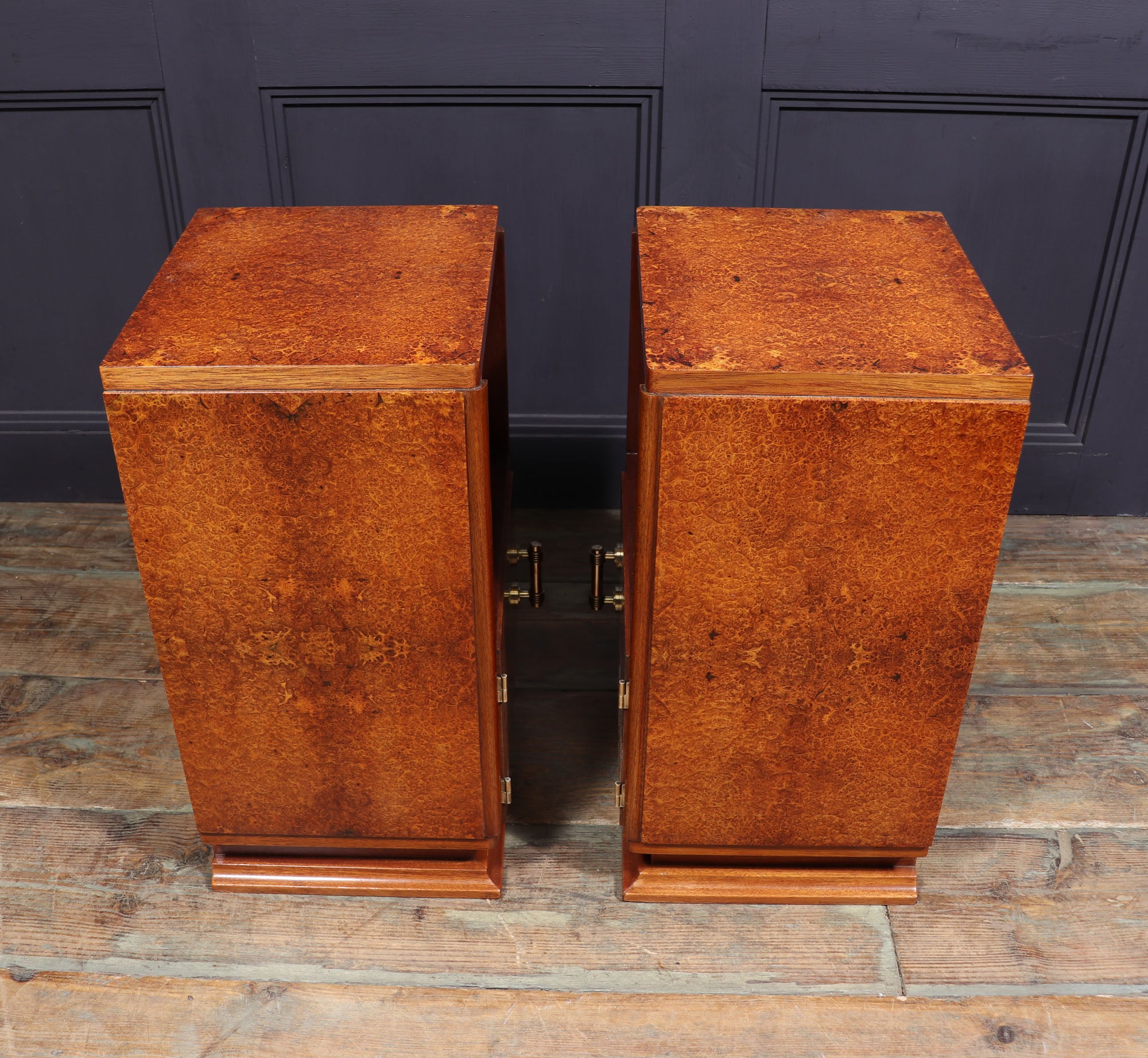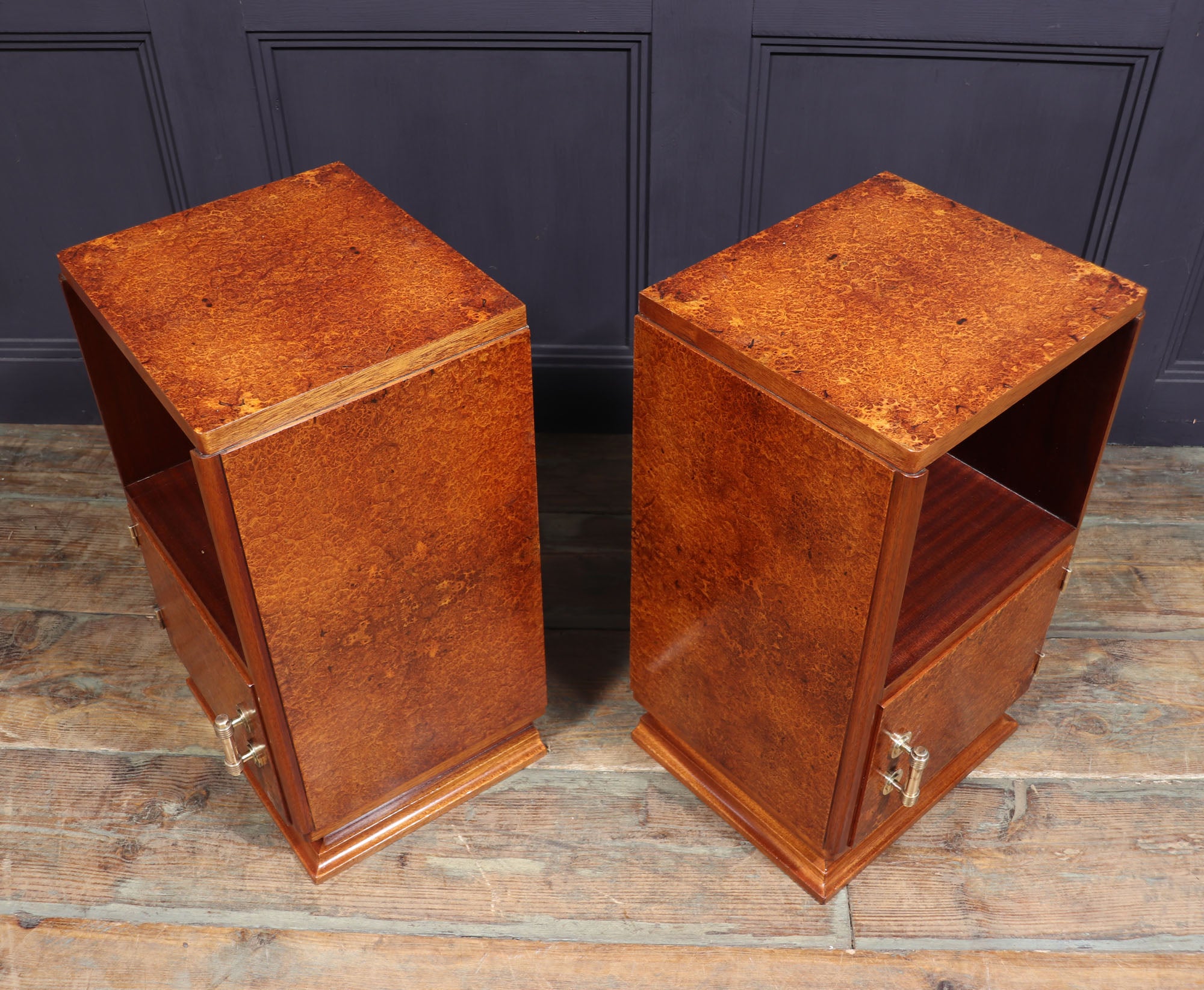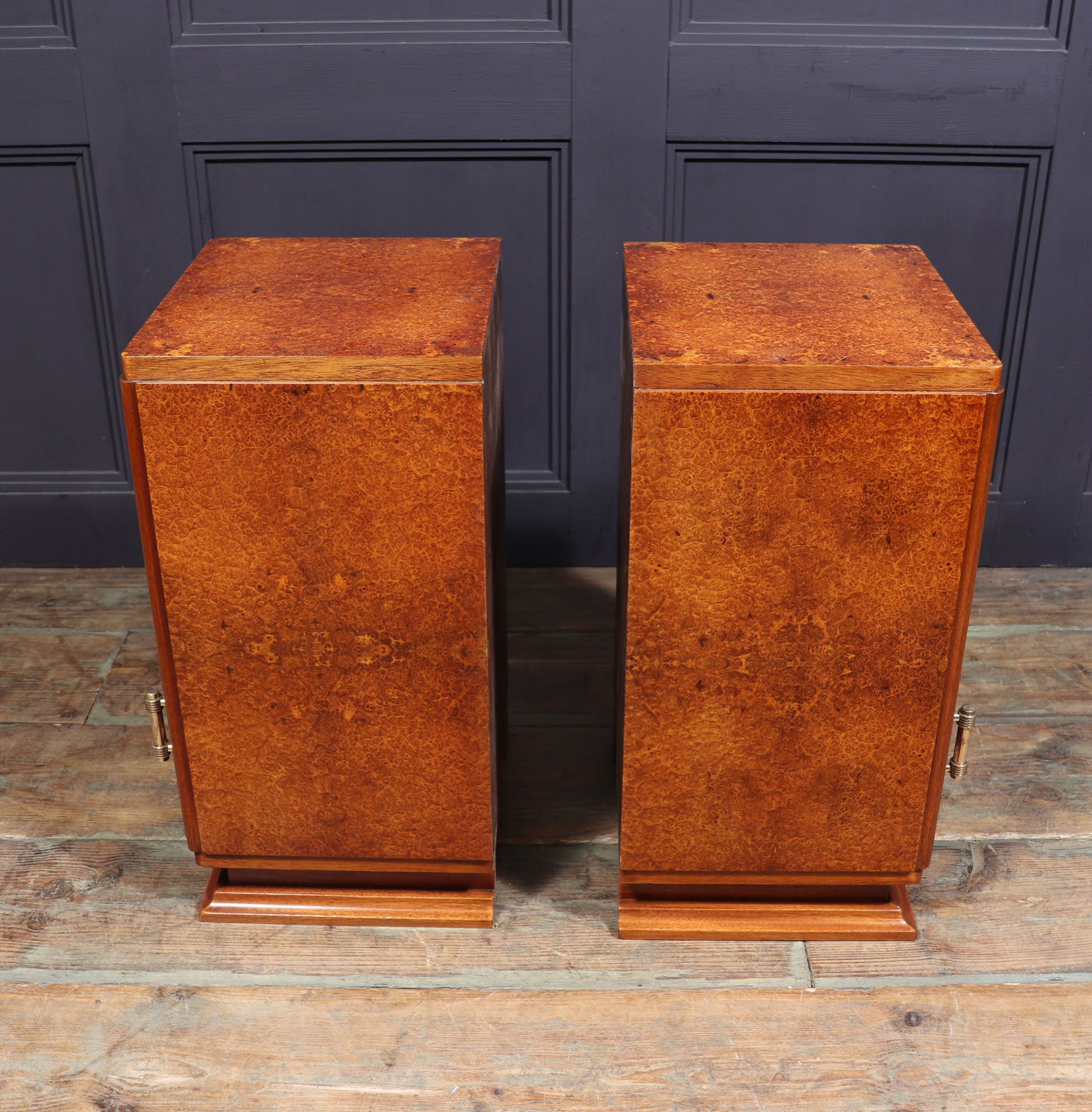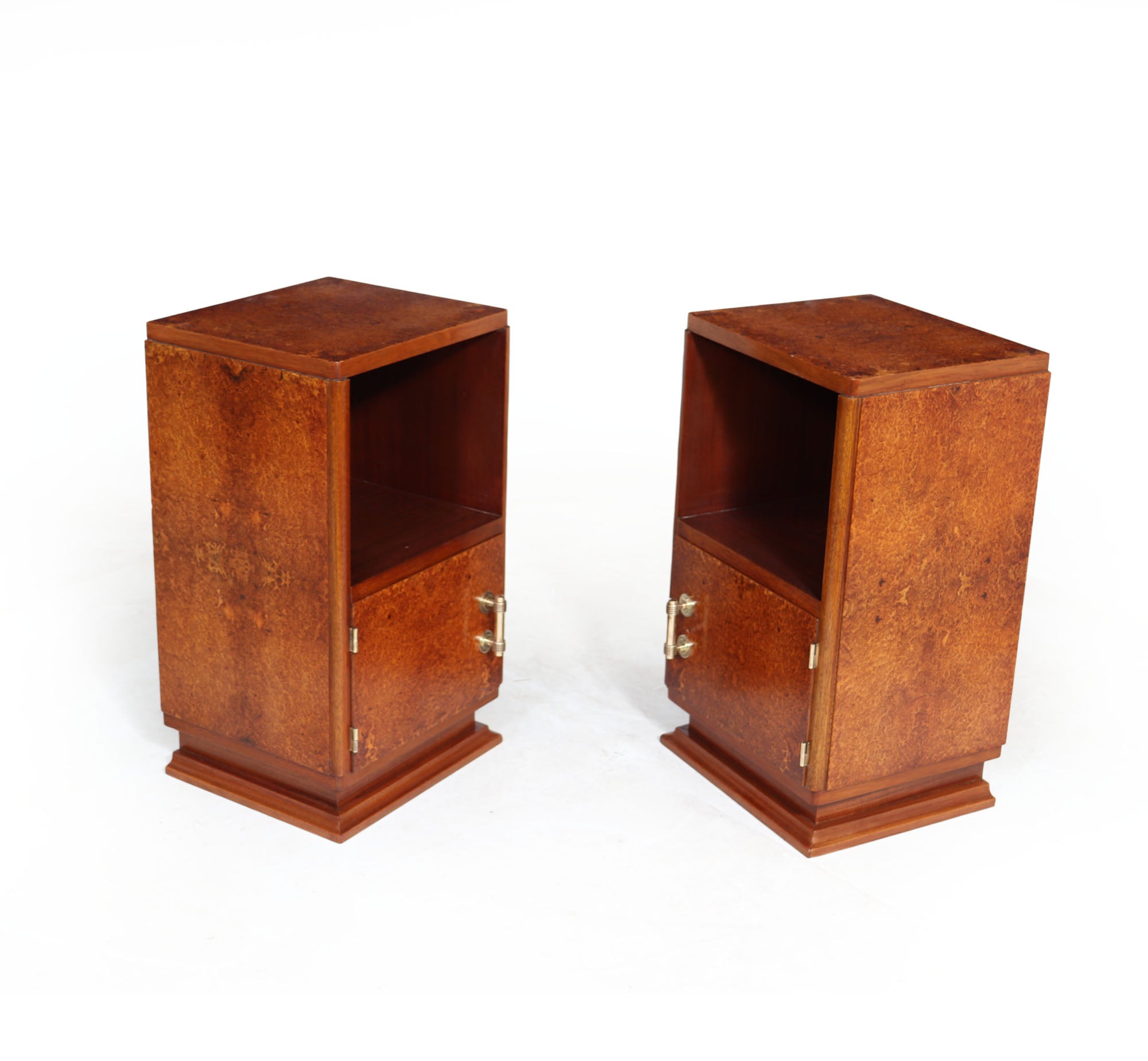 Art Deco Bedside Cabinets Pair of high quality French Art Deco Bedside Cabinets in Amboyna are an exquisite piece of furniture for any interior. These cabinets feature a beautiful single door with bronze handles.