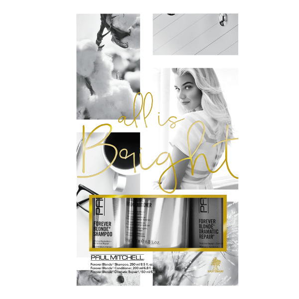 Paul Mitchell Christmas Gift Set – All Is Bright This beautiful gift set is perfect for blonde, bleached high lighted hair. The specially formulated ingredients helps to guard against breakage, helps restore lost moisture elasticity whilst keeping your hair light bright. Gift Set Includes: Paul Mitchell Forever Blonde Shampoo 250mlPaul Mitchell Forever Blonde Conditioner 200ml Paul Mitchell Forever Blonde Dramatic Repair 150mlShampoo The shampoo is perfectly designed to keep your hair light bright whilst protecting against breakage, restoring moisture elasticity.Directions: Massage into wet hair rinse.ConditionerThe conditioner is ideal for blonde, bleached, high lighted high lifted hair leaving your hair soft with a beautiful shine improved elasticity. Directions: Cleanse with Forever Blonde shampoo. Apply a small amount to clean, damp hair rinse.Dramatic RepairThis repair treatment is ideal for rescuing fragile blonde or lightened hair by helping to restore health vitality. With multi-tasking corrector for replenishing dry depleted hair whilst helping to strengthen seal the cuticle. Directions: Shake well before use. Apply to towel-dried hair comb through. Do not rinse. Style as usual.